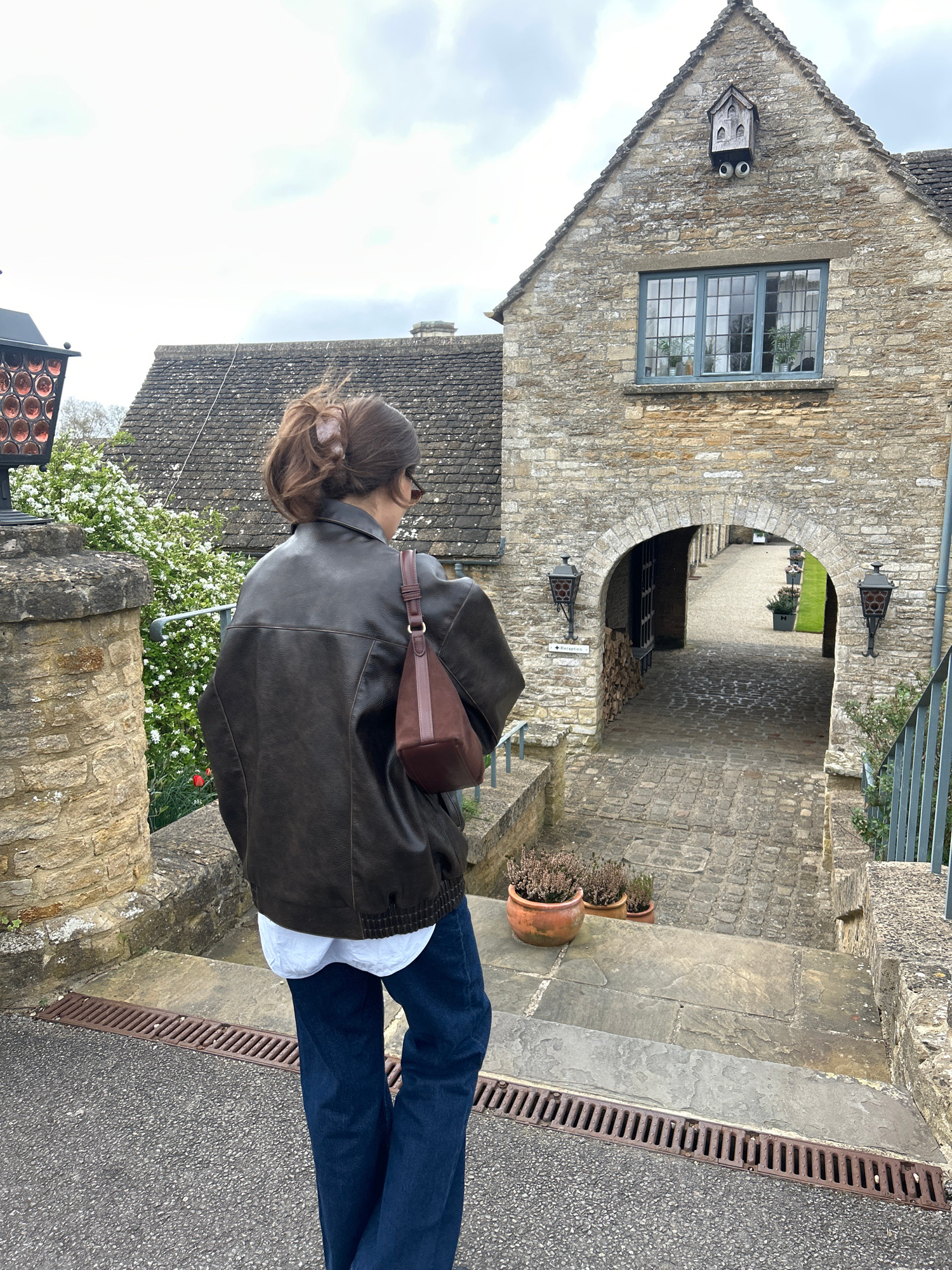 A young woman wearing a dark brown jacket and blue jeans stands on the side of a street in Malmesbury, United Kingdom. She has a brown purse on her shoulder and is looking at the stone building and ar…read more