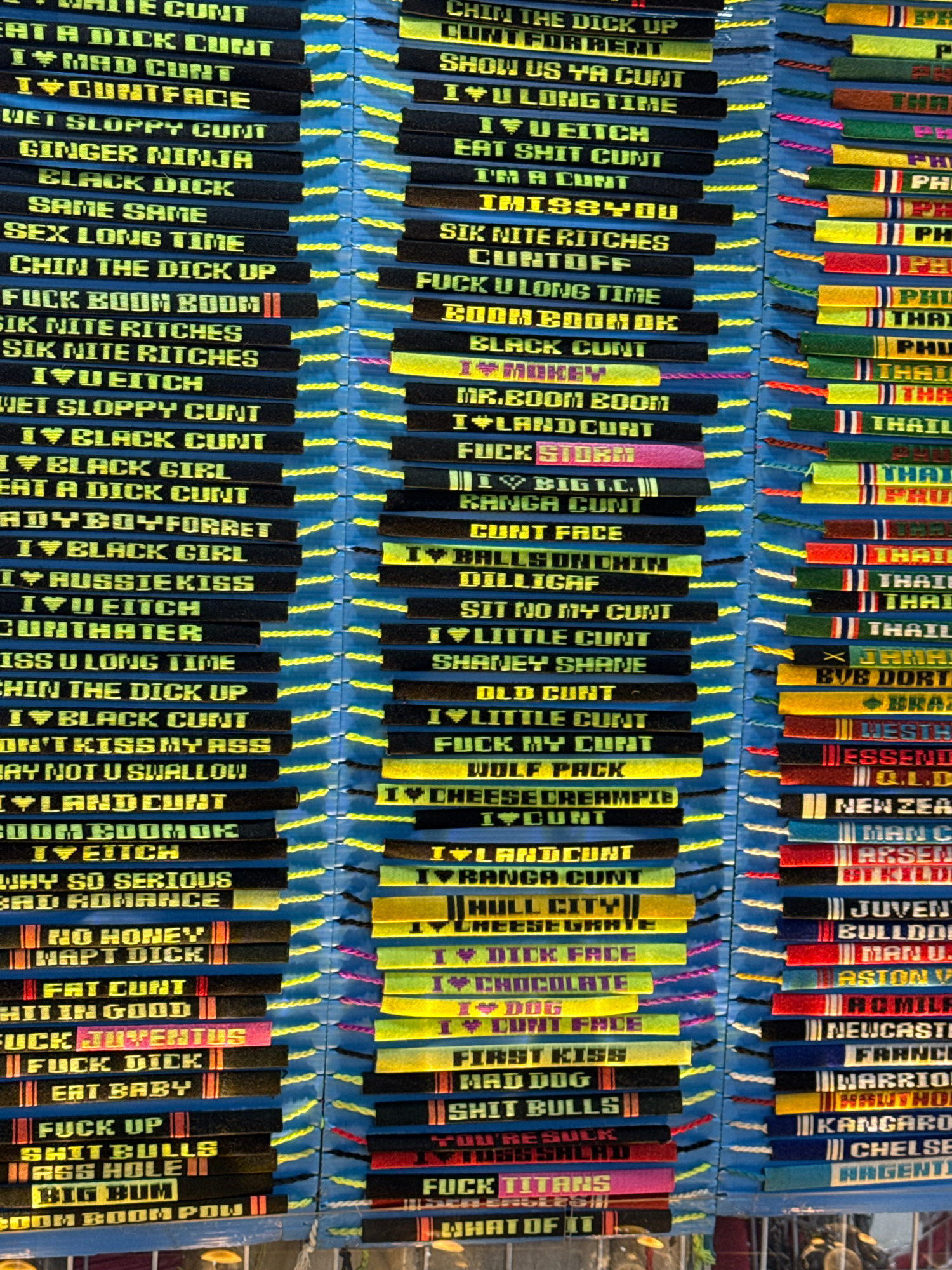 The image shows a display of novelty keychains or wristbands, likely for sale in a tourist area. Each band is dark, possibly black, with text in a bright yellow/green color. The text features sexually…read more