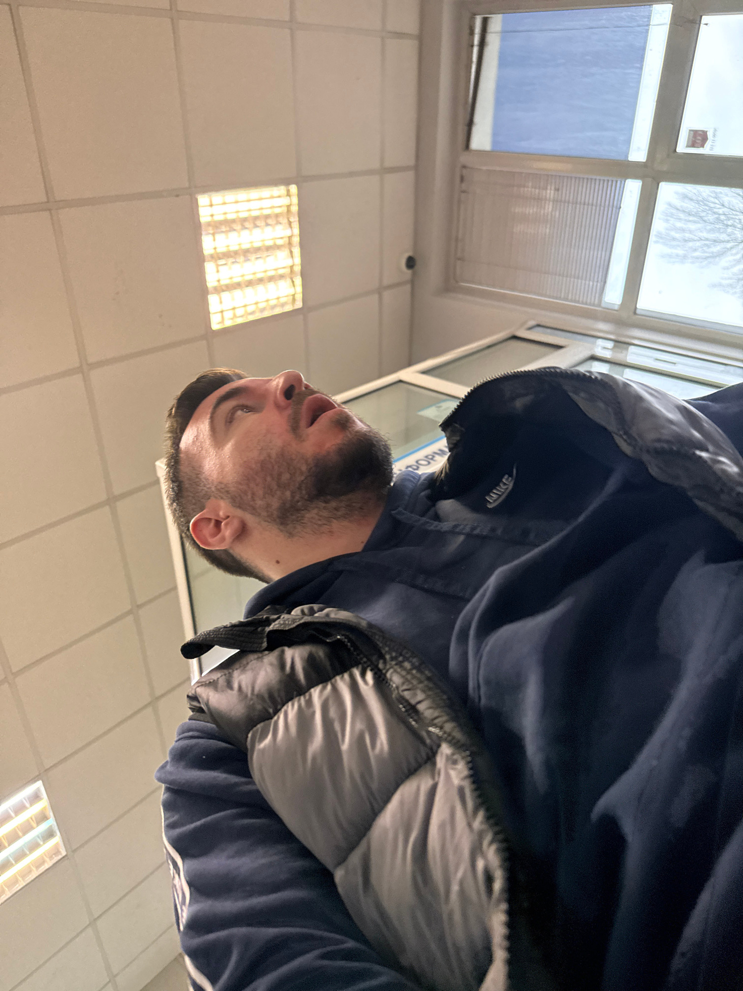 A low-angle shot shows a man standing inside a building. He is wearing a dark blue jacket with a gray lining, and a Nike logo is visible on the jacket. The man has a beard and is looking upwards. Theβ¦read more
