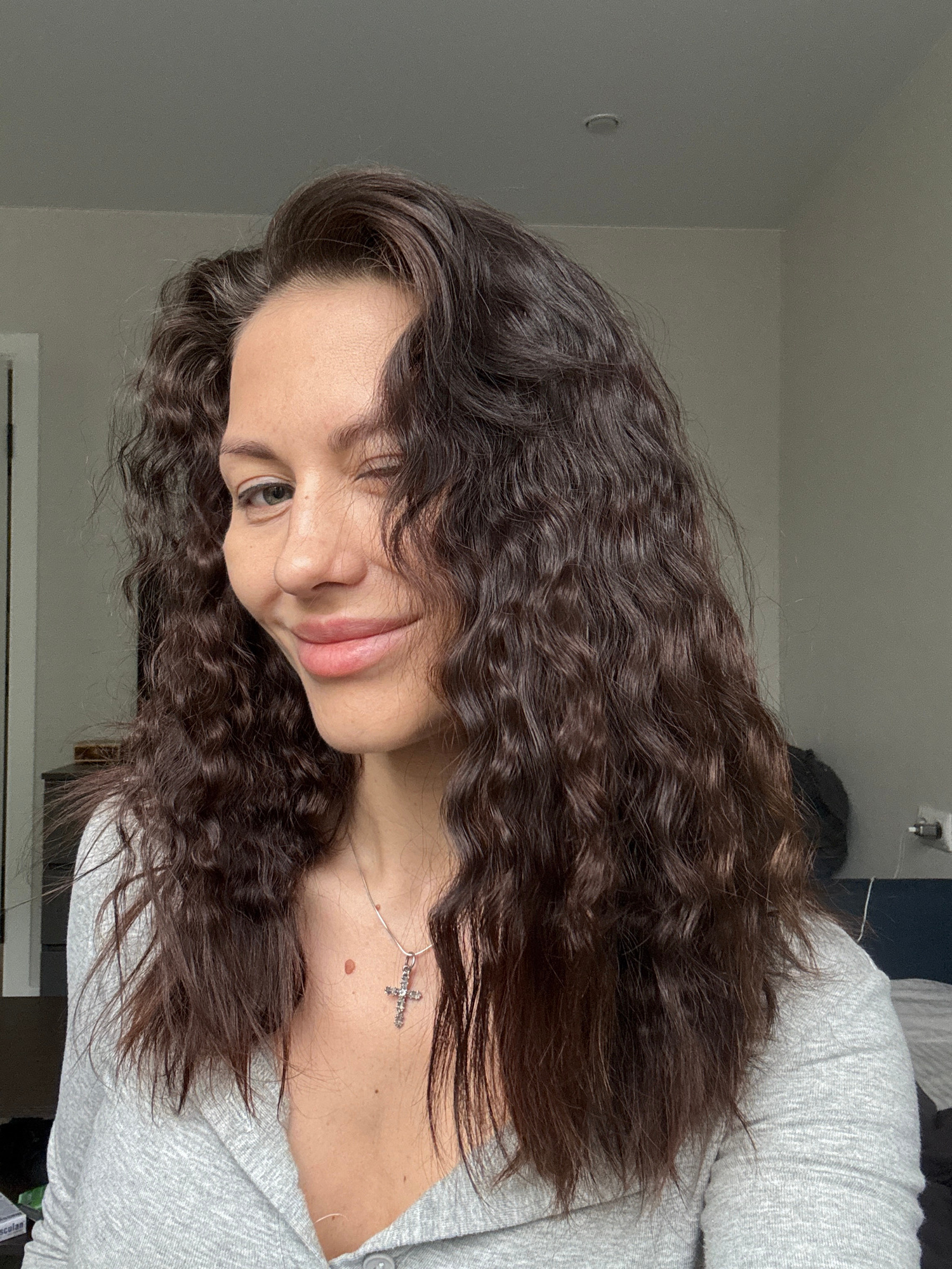 A young woman with long, dark curly hair is angled slightly towards the camera. She is fair-skinned, wearing a gray cardigan, and a silver cross necklace is visible around her neck. The background inc…read more