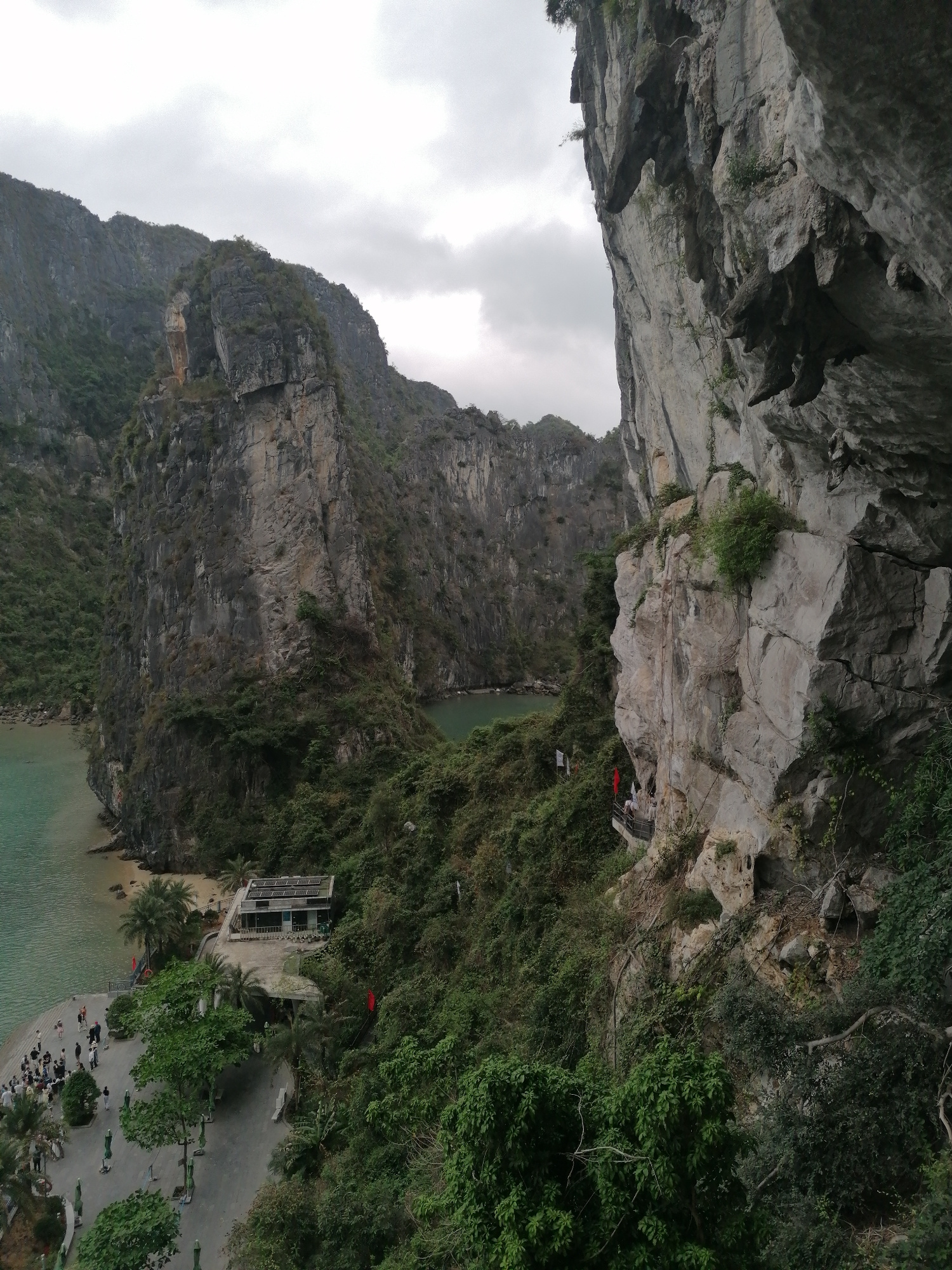 This panoramic image captures a breathtaking view of a towering limestone karst landscape in what appears to be Ha Long Bay or a similar area near Hồng Gai, Vietnam, under an overcast sky. The scene…read more