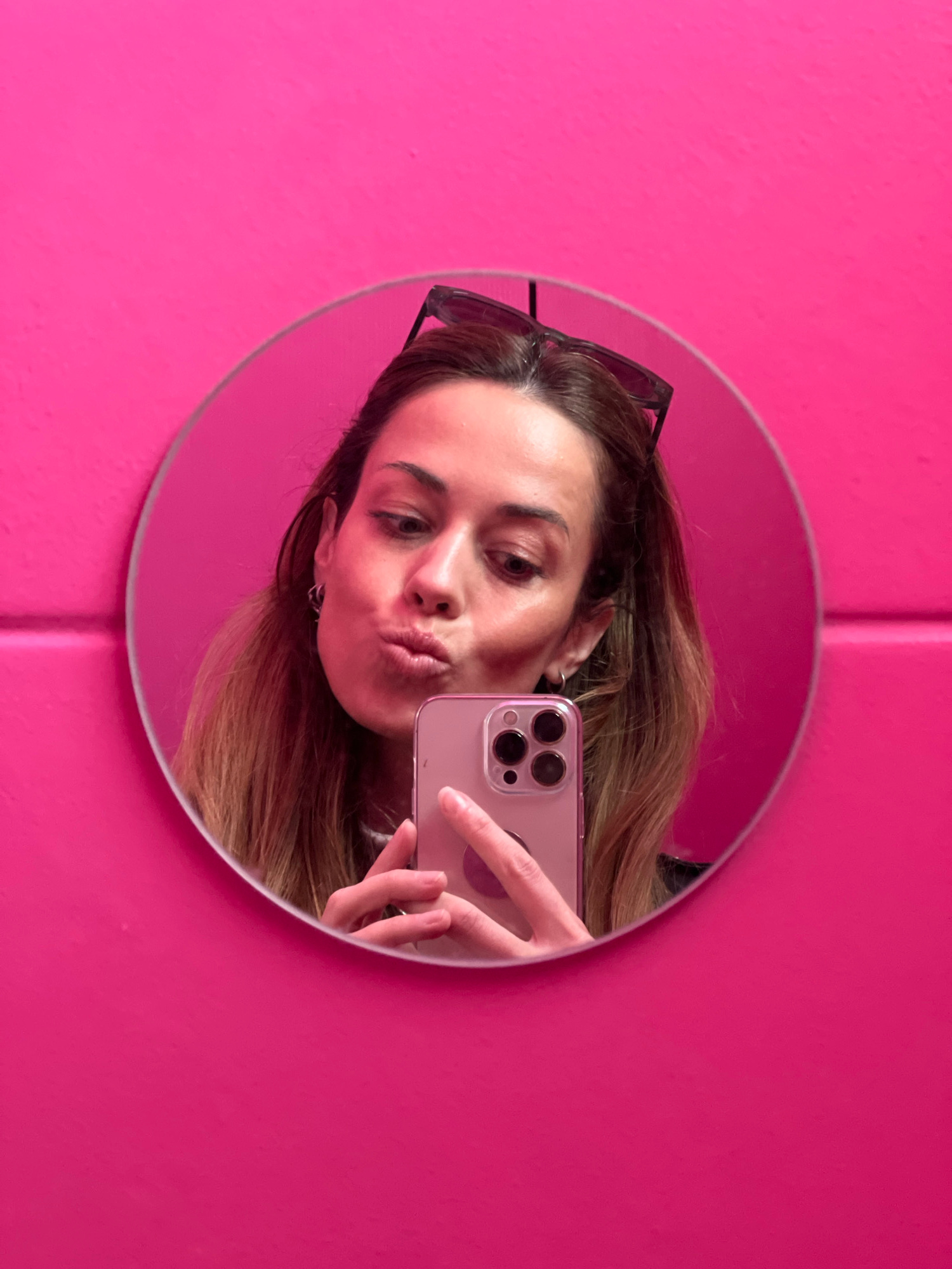 A woman with long brown hair is taking a selfie in a round mirror. The mirror is mounted on a bright pink wall. The woman is making a kissing face. She is holding a pink iPhone. The wall has a vertica…read more