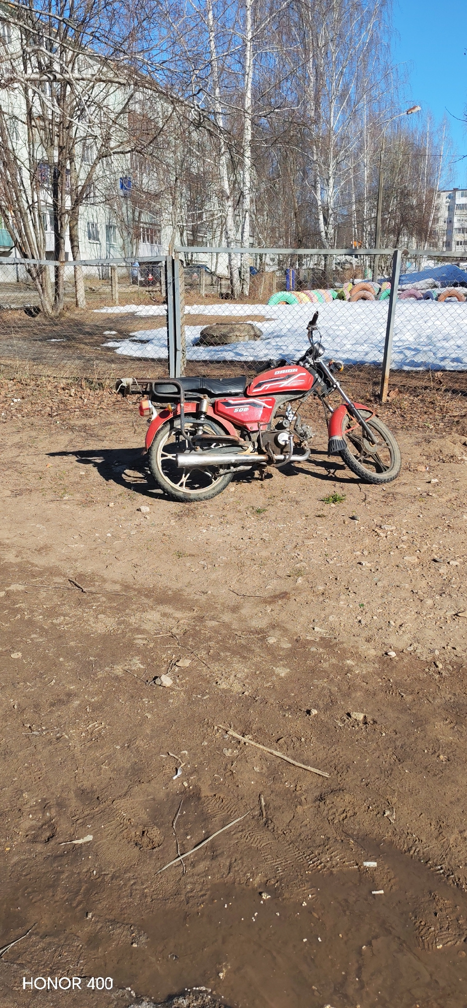 A red Orion 50Q motorcycle is parked on a dirt patch. A chain-link fence runs behind the motorcycle, separating the dirt patch from a snow-covered area with tires used as playground equipment. Buildinβ¦read more