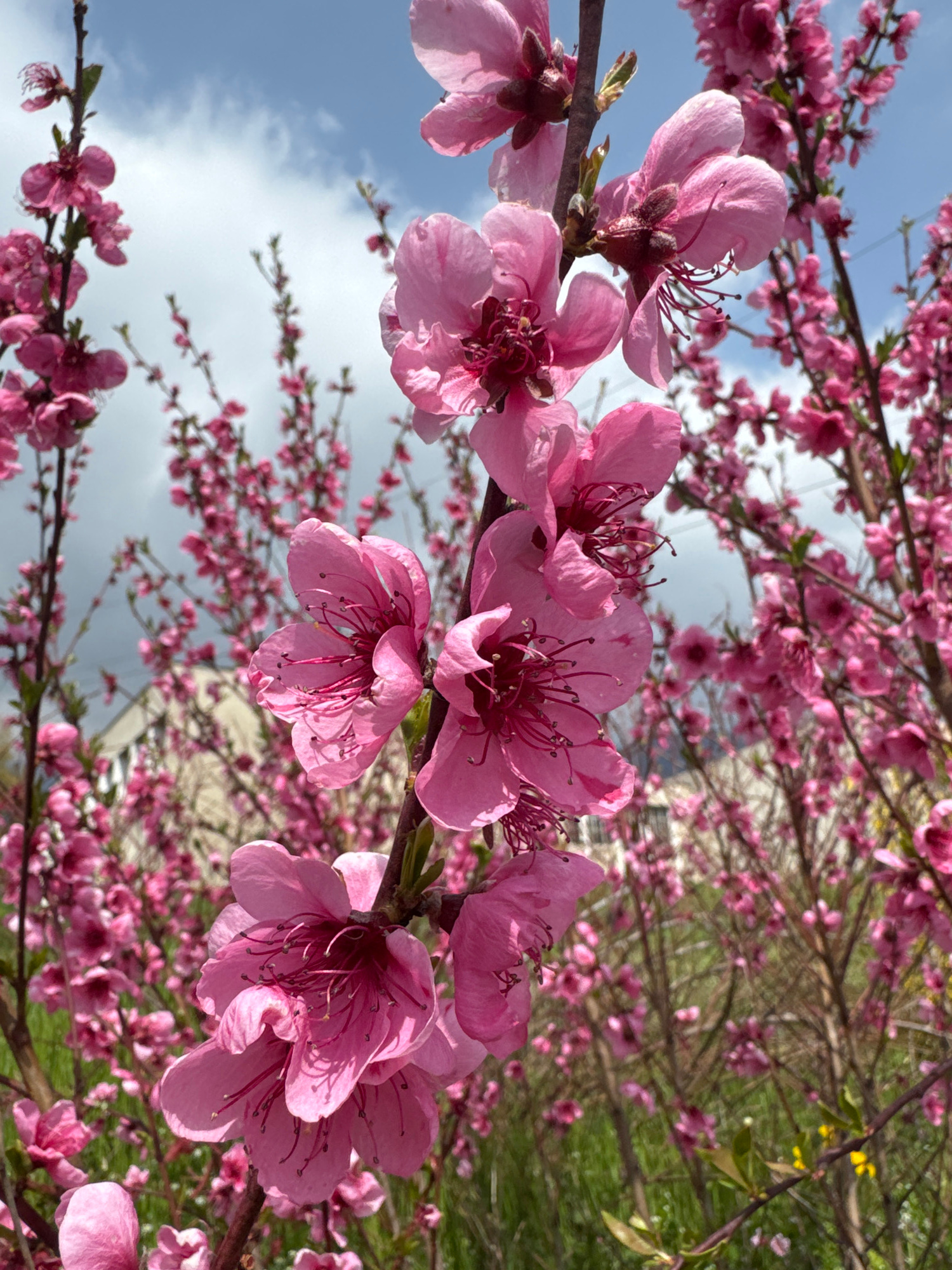 The image shows a close-up view of pink flowers blooming on a tree branch. The flowers have delicate petals and prominent stamens. In the background, there are more branches covered in pink blossoms,…read more