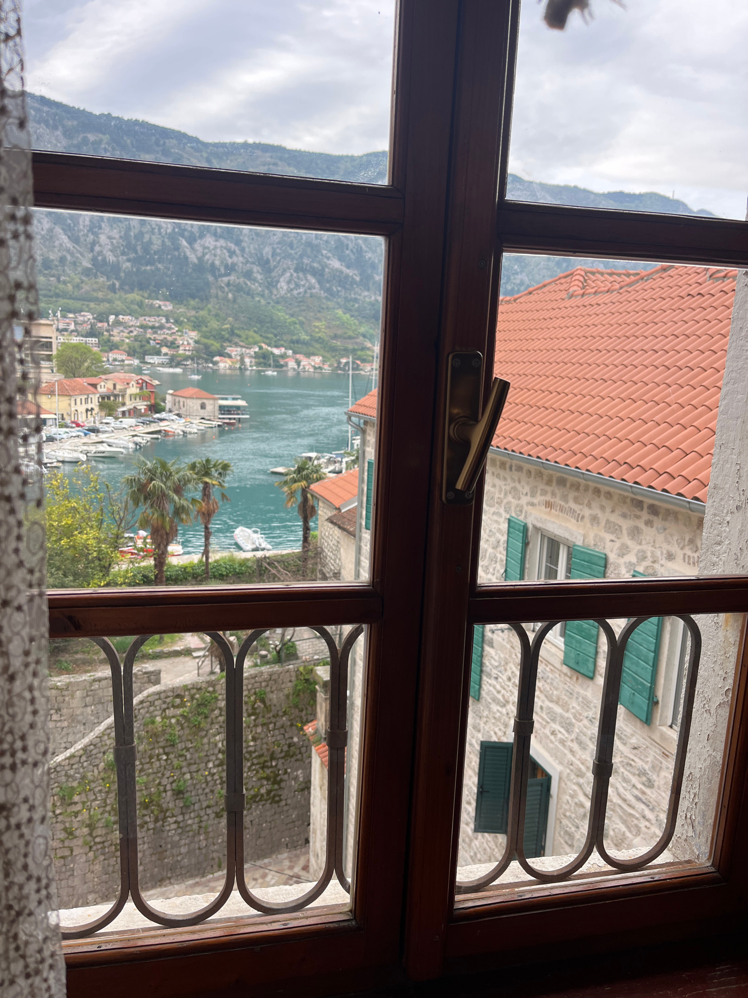 A view from within a building in Kotor, Montenegro, is framed by a wooden window. The view is horizontally bisected by the window frame. The top two panes show a tiled roof and a building with stone c…read more