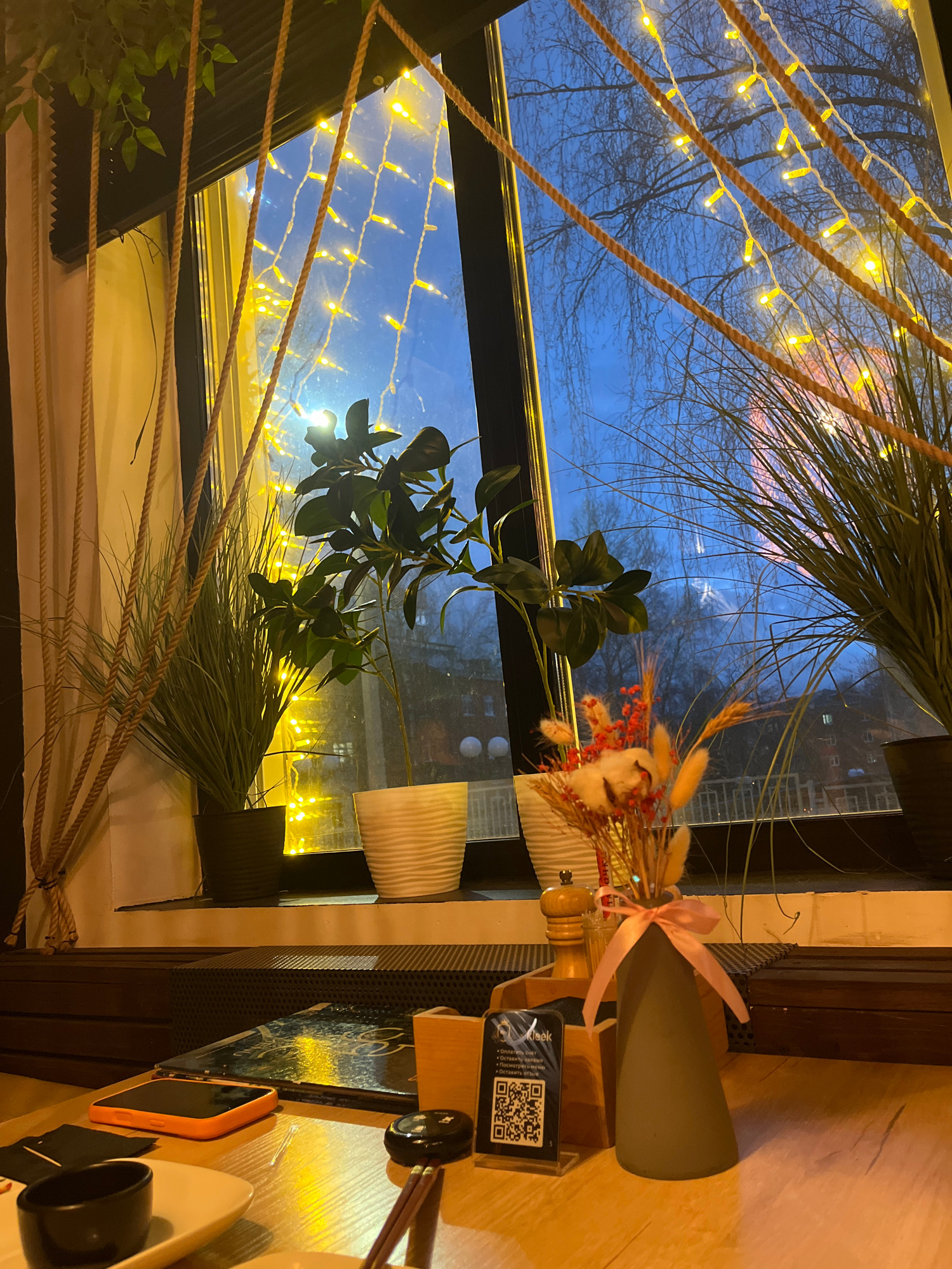 The image depicts a cozy interior scene viewed through a window during the evening or night. Warm yellow fairy lights are strung horizontally across the window pane, interspersed with thick, braided r…read more
