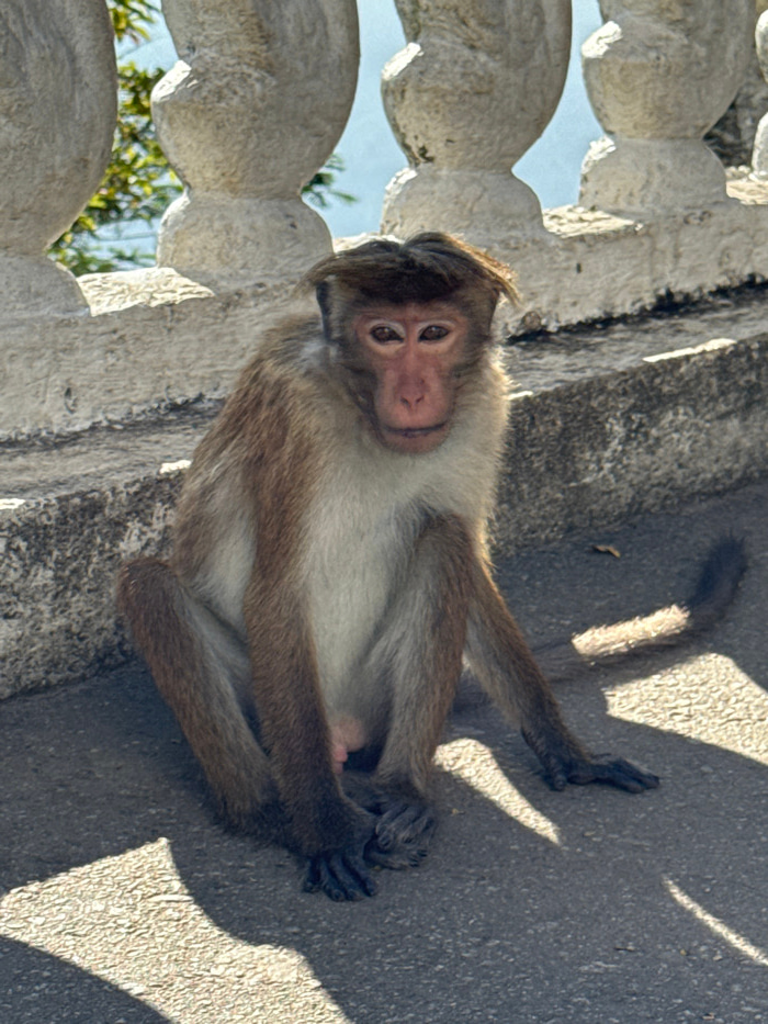 A medium-sized monkey rests on a concrete surface, its body angled towards the camera. The monkey has light brown fur on its back and limbs, with a lighter beige color on its chest. Its hands and feet…read more
