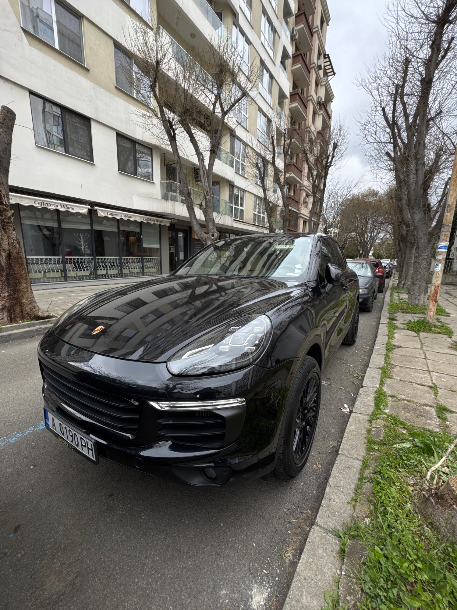 A black Porsche Cayenne is parked on a street next to a building in Burgas, Bulgaria. The building has a "Caffetteria Milano" sign. Other vehicles are parked further down the street. Bare trees line t…read more
