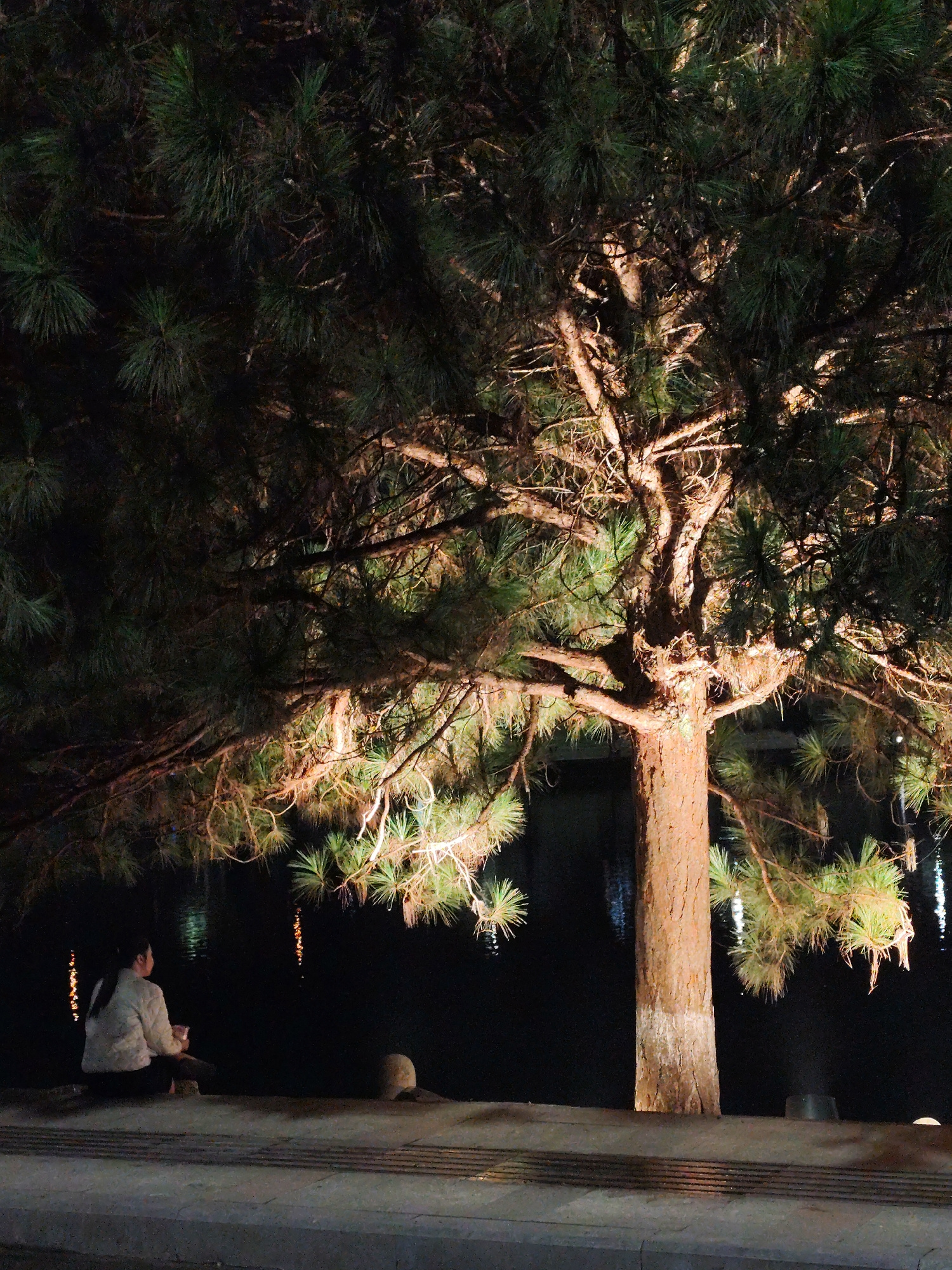 A person sits on a concrete ledge next to a body of water at night. A large pine tree stands to the right, illuminated by an unseen light source. The trunk is brown, and the needles are dark green, wi…read more