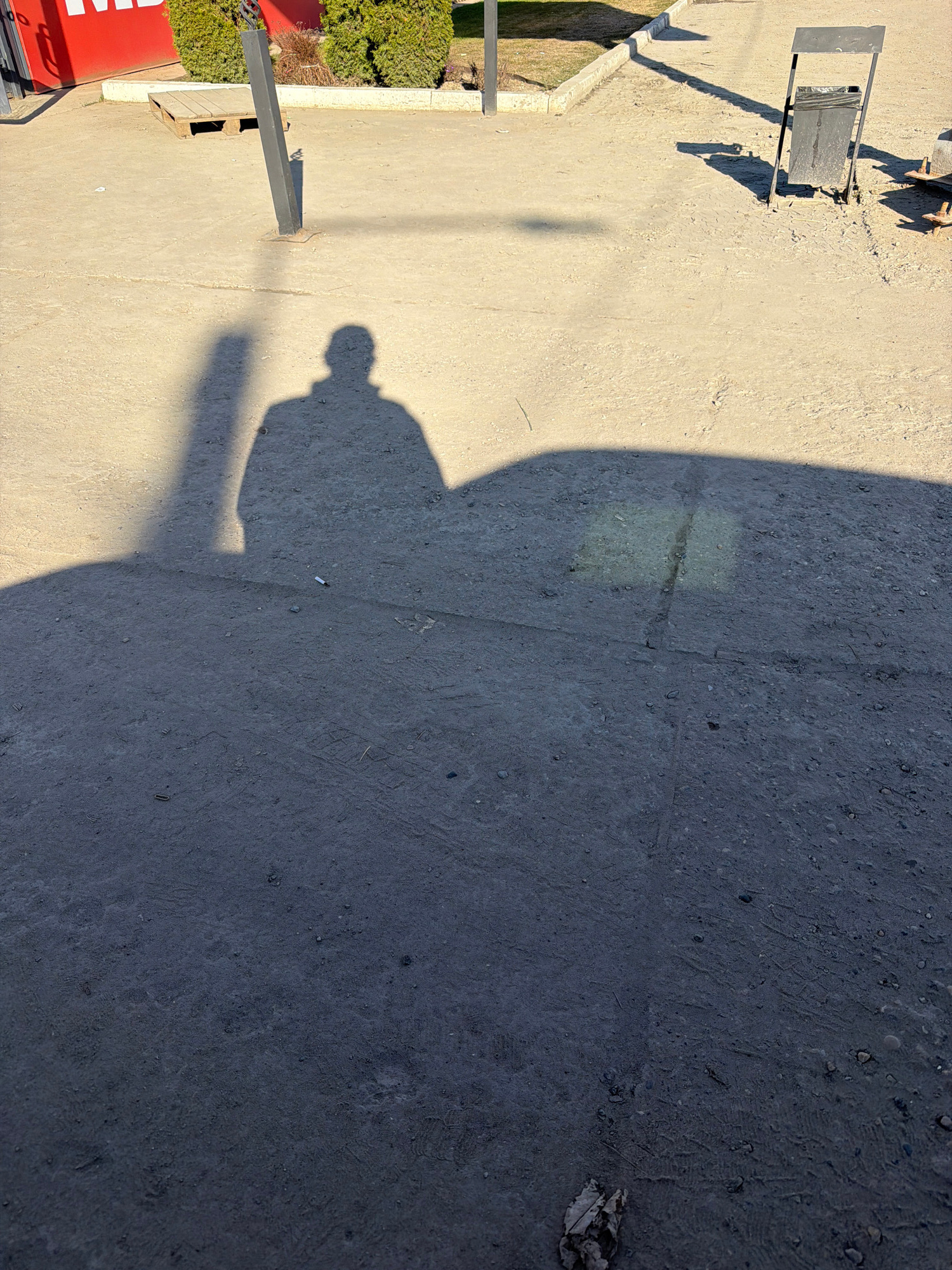 An overhead, high-angle shot captures an outdoor scene dominated by strong shadows on paved ground. The image is oriented vertically, with subjects appearing sideways. The ground is split into two di…read more