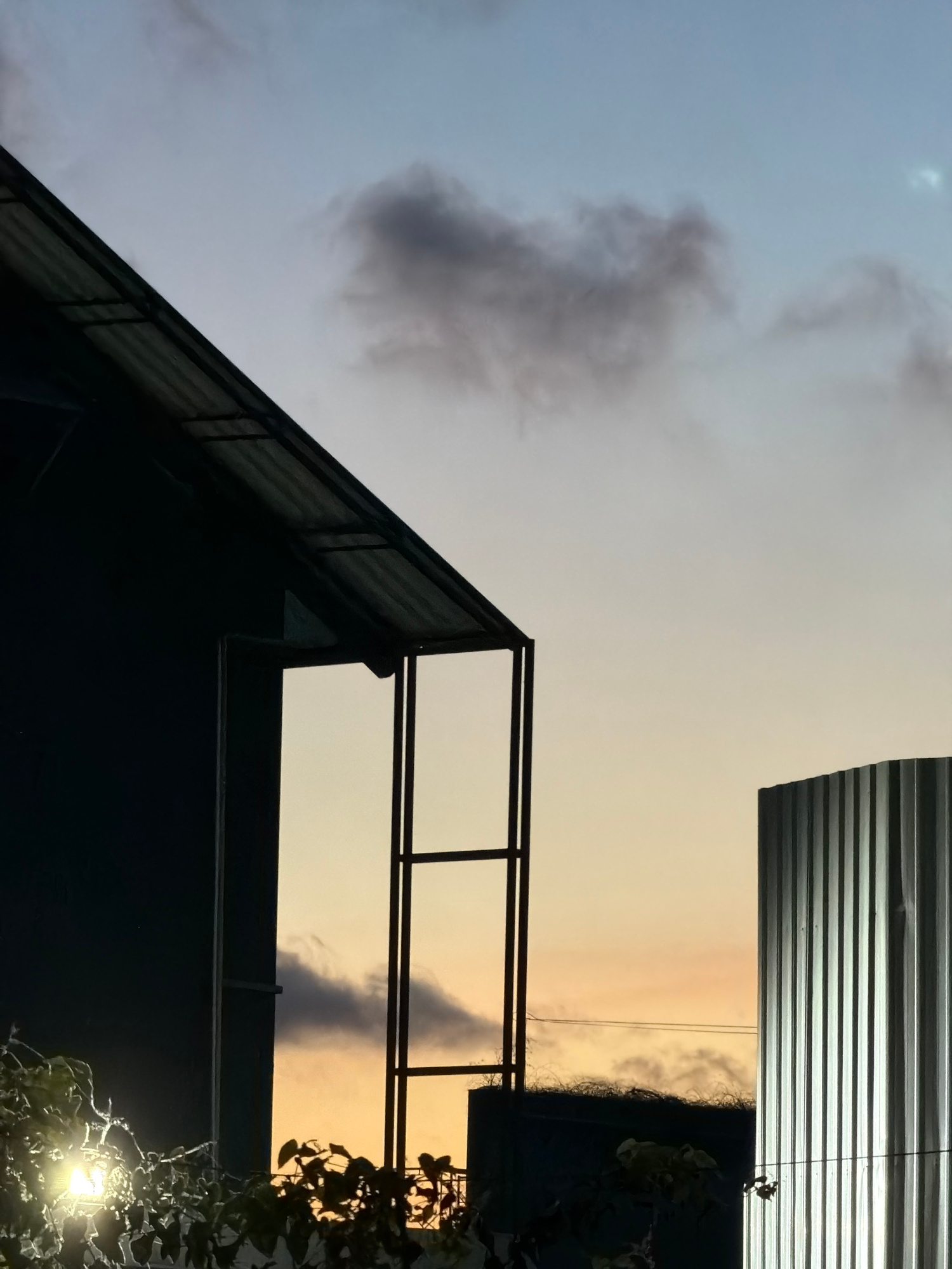 The photograph, likely taken in North Kuta, Indonesia, depicts a low-angle view of the urban environment at dusk or dawn. The sky transitions from a light yellow near the horizon to a light gray above. Clouds are present. In the foreground, structural elements of buildings are prominent, appearing as dark silhouettes. There's corrugated metal roofing on the top and lower left. A dark, square frame is also visible. To the right of the frame, dense foliage hangs with a point of light reflection that may be sunlight or a light source. The scene lacks human presence. | Open Wire