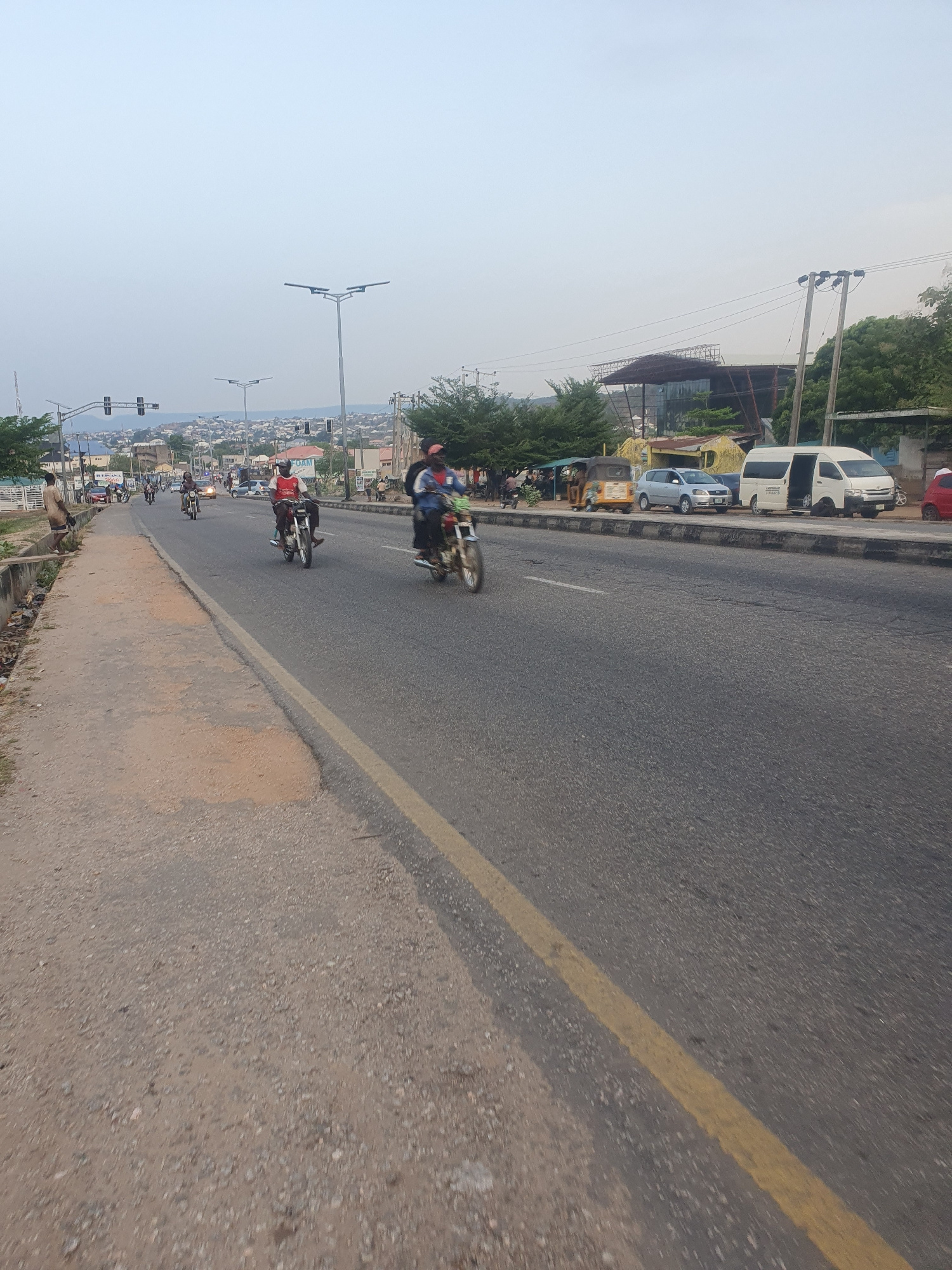 The image shows a street scene in Lokoja, Nigeria, with multiple motorcycles traveling along a paved road. A solid yellow line marks the center of the road. Parked vehicles are visible on the side of…read more