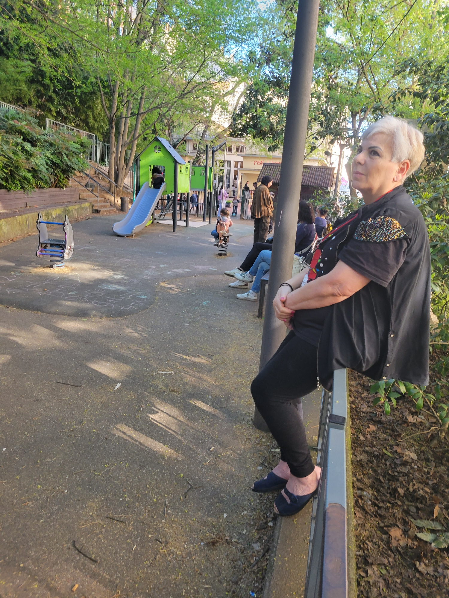An adult woman with short white hair is posing at a playground in Lyon, France. She is leaning forward while grasping a metal pole and railing. She is wearing a black shirt, black jacket, and black pa…read more