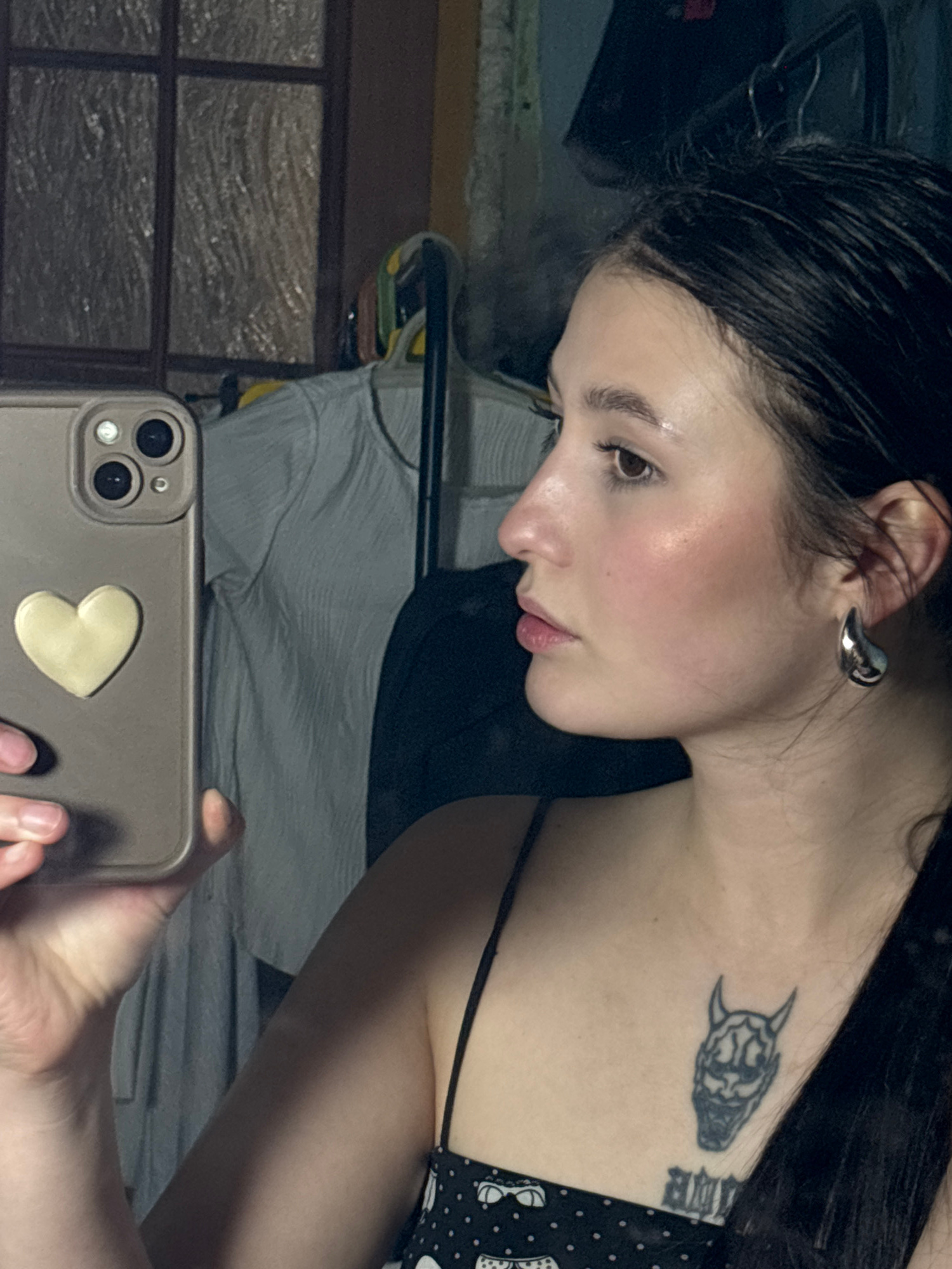 A woman is taking a selfie in an indoor environment. She has dark hair that appears to be wet or styled with product. Her skin is fair, and she is wearing a silver earring on her left ear. There is a…read more
