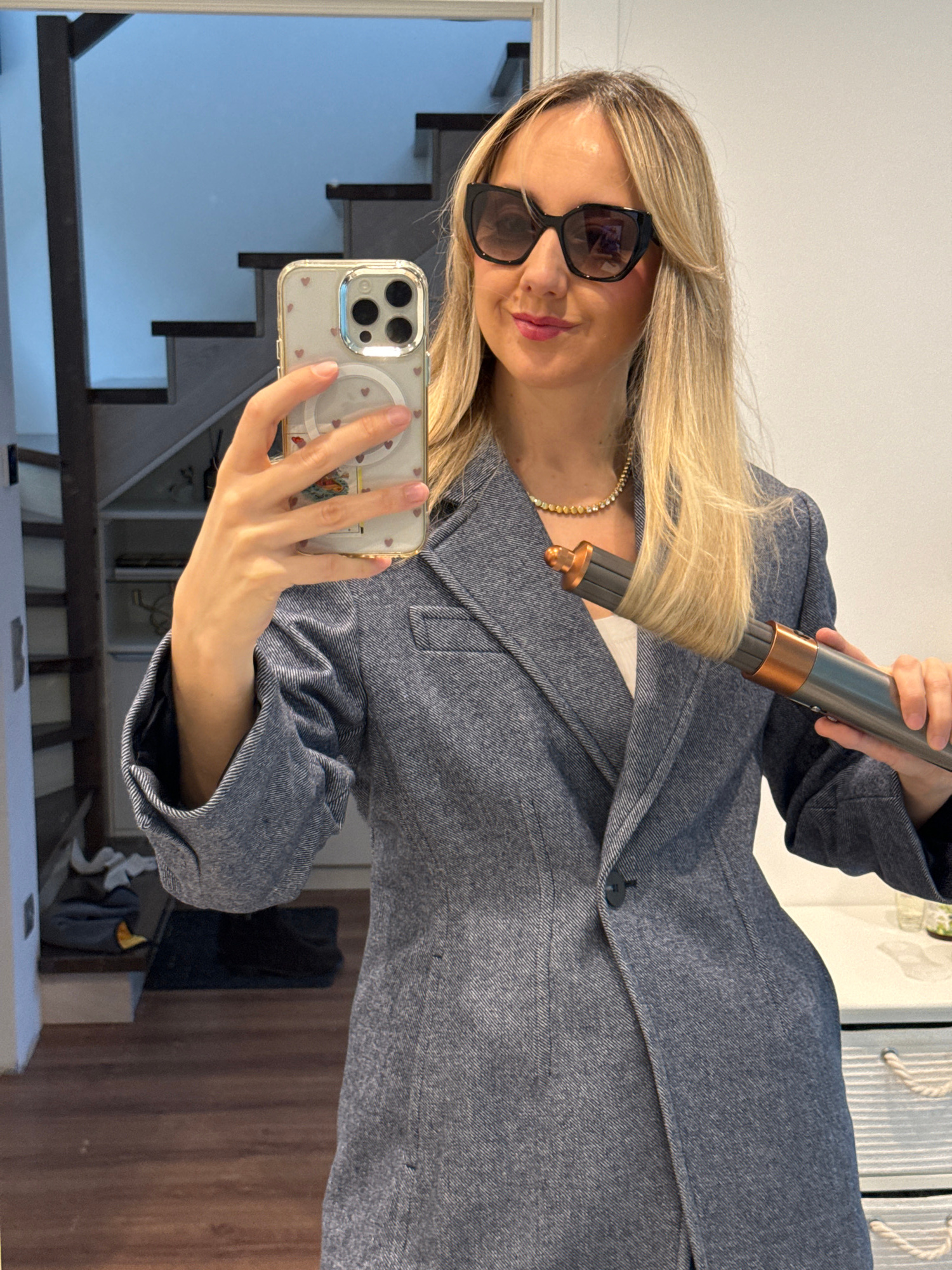 A woman with blonde hair is using a Dyson Airwrap hair styler in front of a mirror. She is wearing sunglasses and a gray blazer, and she is holding a smartphone to take a selfie. The reflection in theβ¦read more