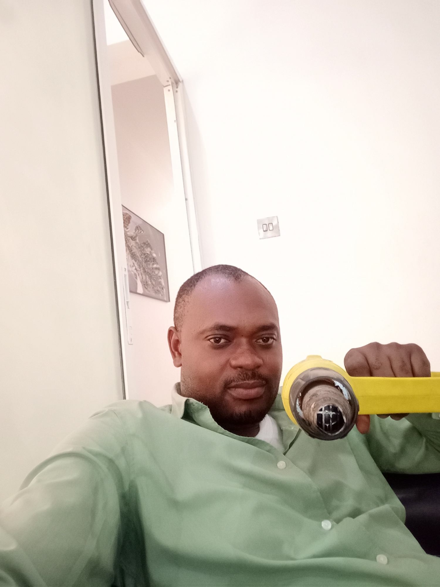 A man, likely in his 30s or 40s, with dark skin, short dark hair, and a beard, is featured in a close-up indoor photograph taken in Gwarinpa, Nigeria. He is wearing a light green collared shirt over a…read more