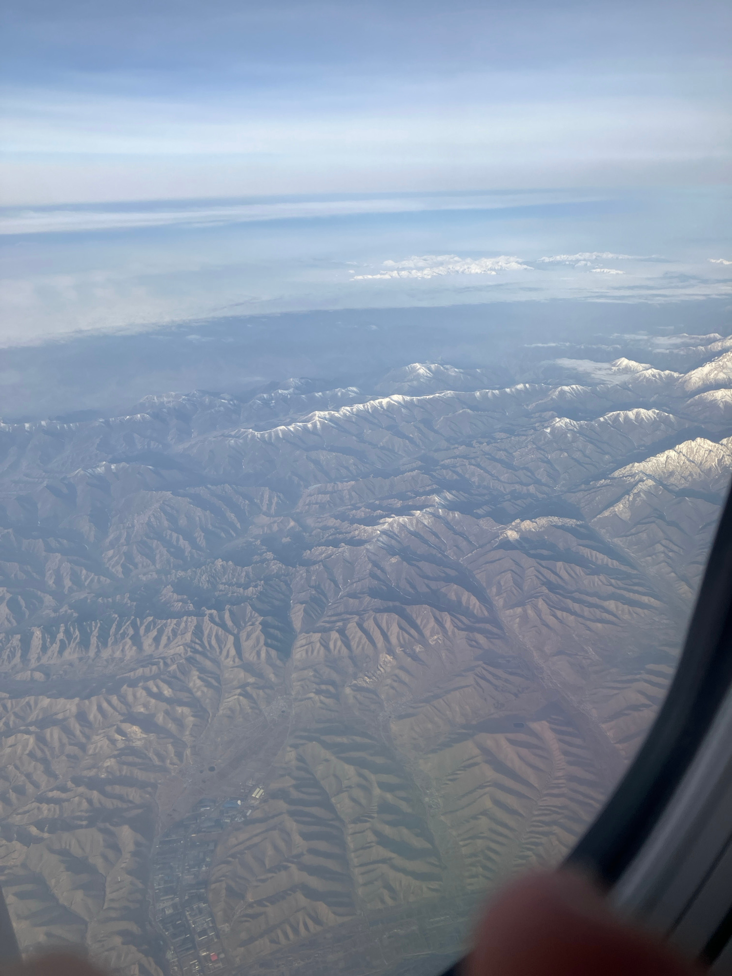 A landscape with rugged, textured mountains is viewed through an airplane window. The mountains have a layered appearance, with many ridges and valleys. A sky with varying shades of blue and white cov…read more