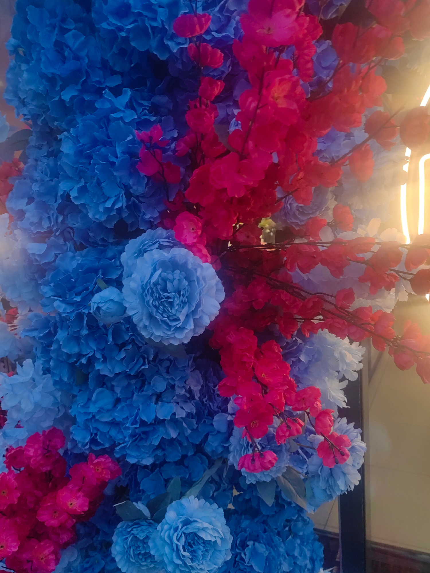 The image captures a floral display featuring predominantly blue hydrangea-like flowers interspersed with vibrant pink blossoms. The flowers are densely packed together, creating a visually rich textu…read more