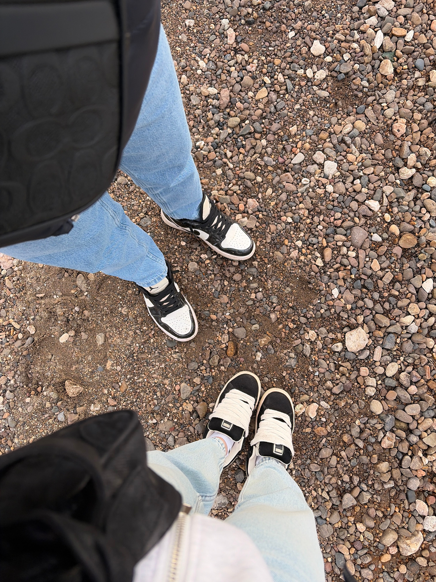 Two pairs of legs wearing jeans and sneakers stand on a surface covered in small pebbles and dirt. The pair on the left wears black and white sneakers, while the pair on the right wears black sneakers…read more