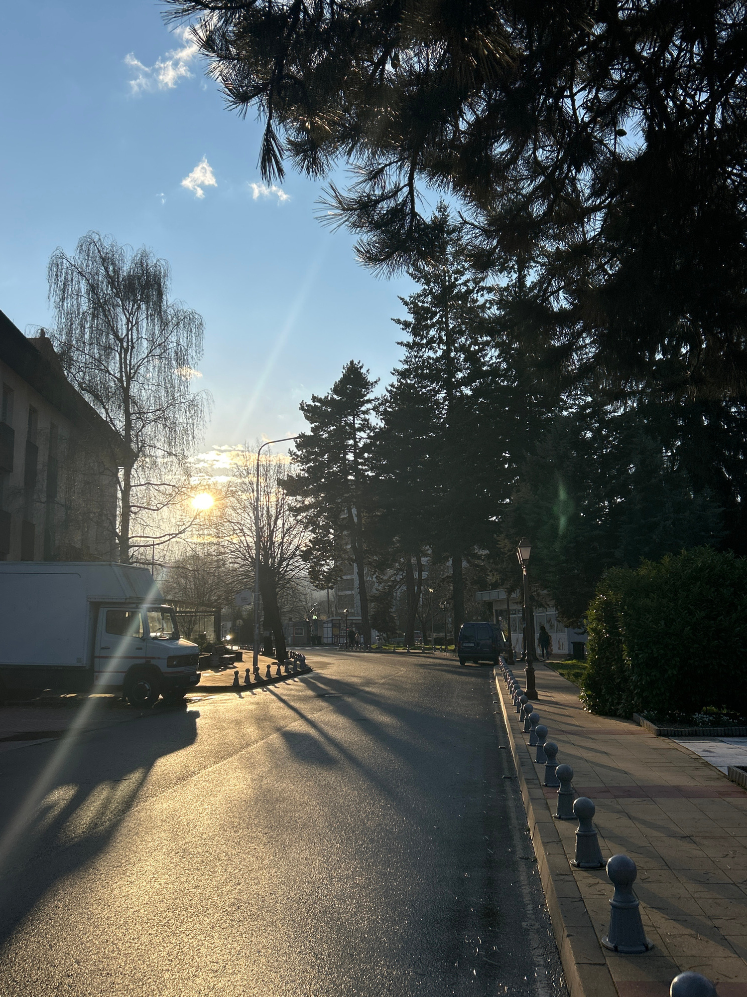 The image shows a street scene in Zlatograd, Bulgaria, with the sun low in the sky. The street is paved with asphalt, reflecting the golden sunlight. A line of metal bollards runs along the edge of th…read more