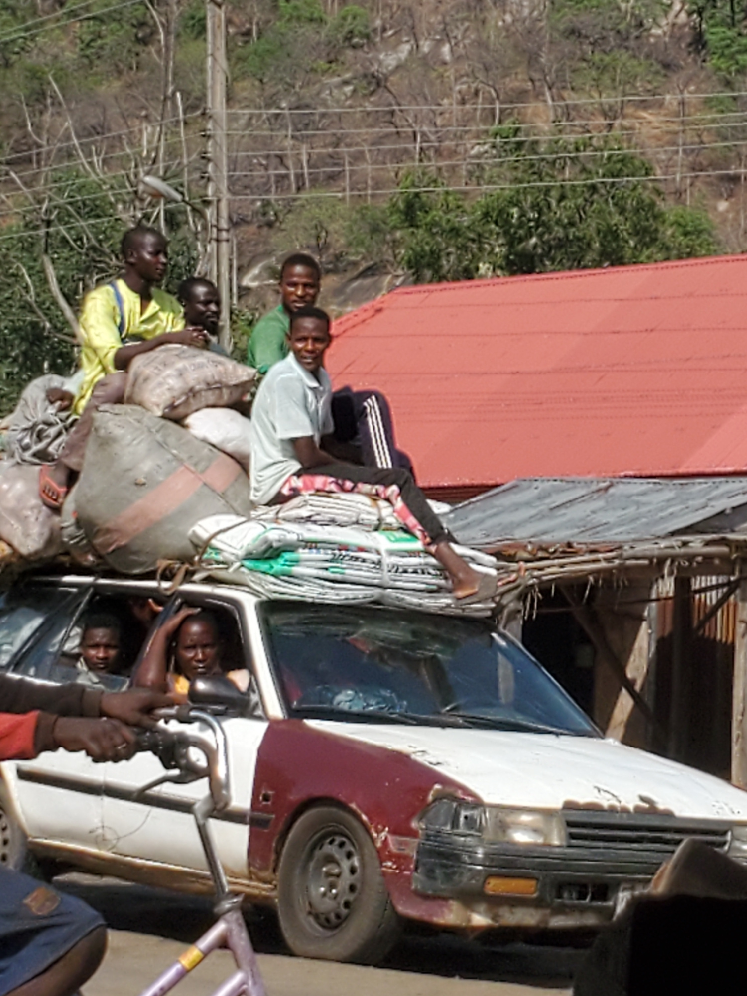 The image depicts a car overloaded with people and goods in Mararaba, Nigeria. Several individuals are crammed inside the vehicle, while others are sitting atop bags and bundled materials loaded on th…read more