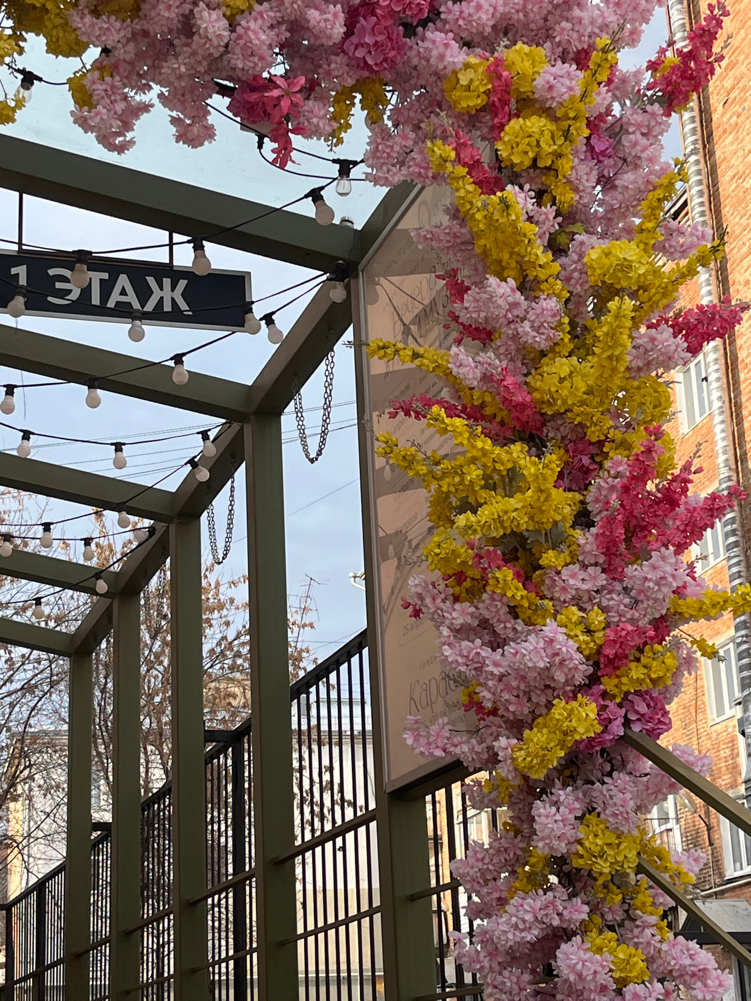 The image depicts a street scene in Izhevsk, Russia. An ornamental archway is decorated with abundant artificial pink, yellow, and red flowers, positioned over what appears to be an entrance or pathwa…read more