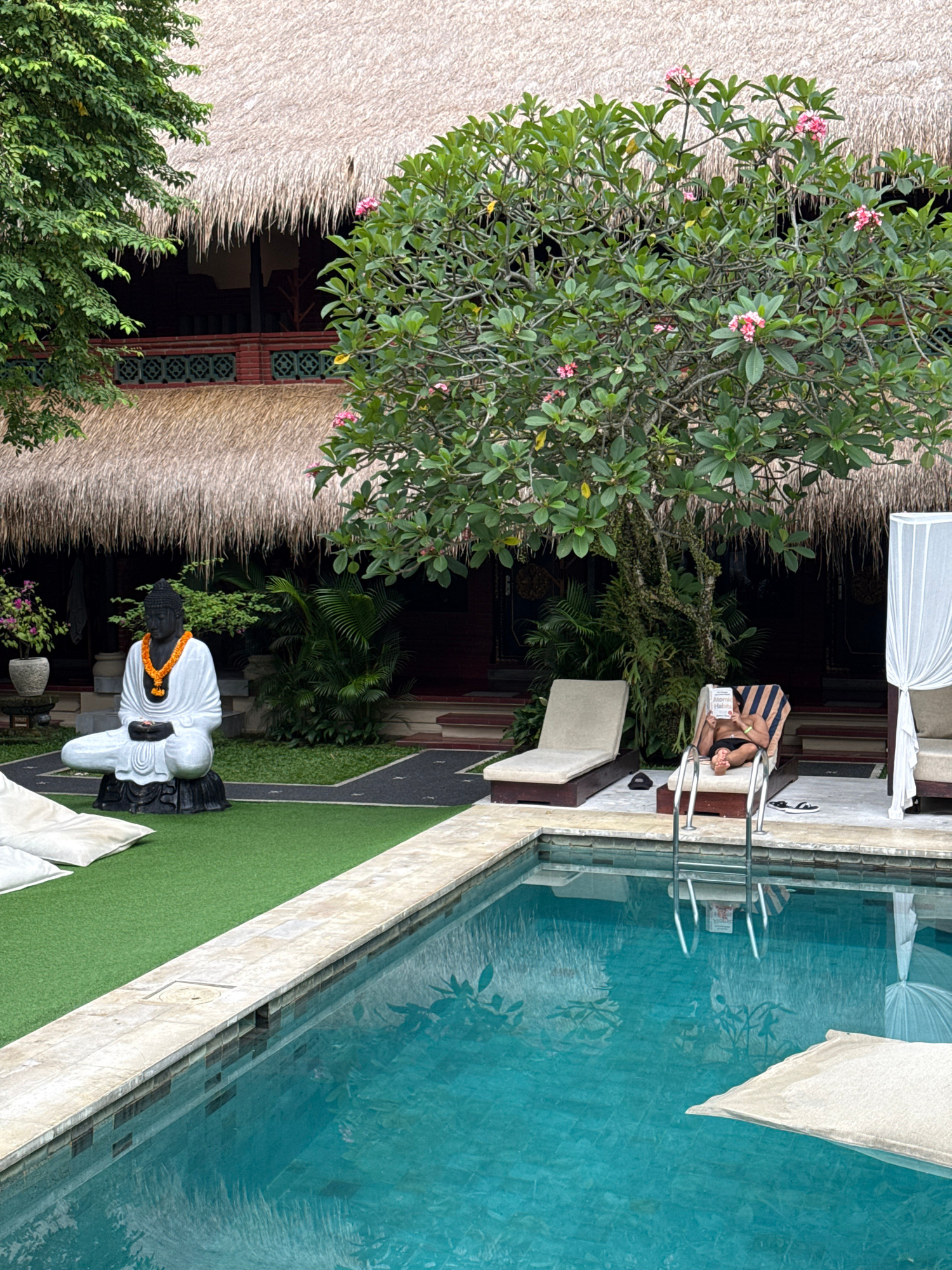This image captures a serene outdoor scene, likely a resort or private villa in Ubud District, Indonesia. The setting features a clear blue swimming pool alongside a lush tropical garden and tradition…read more