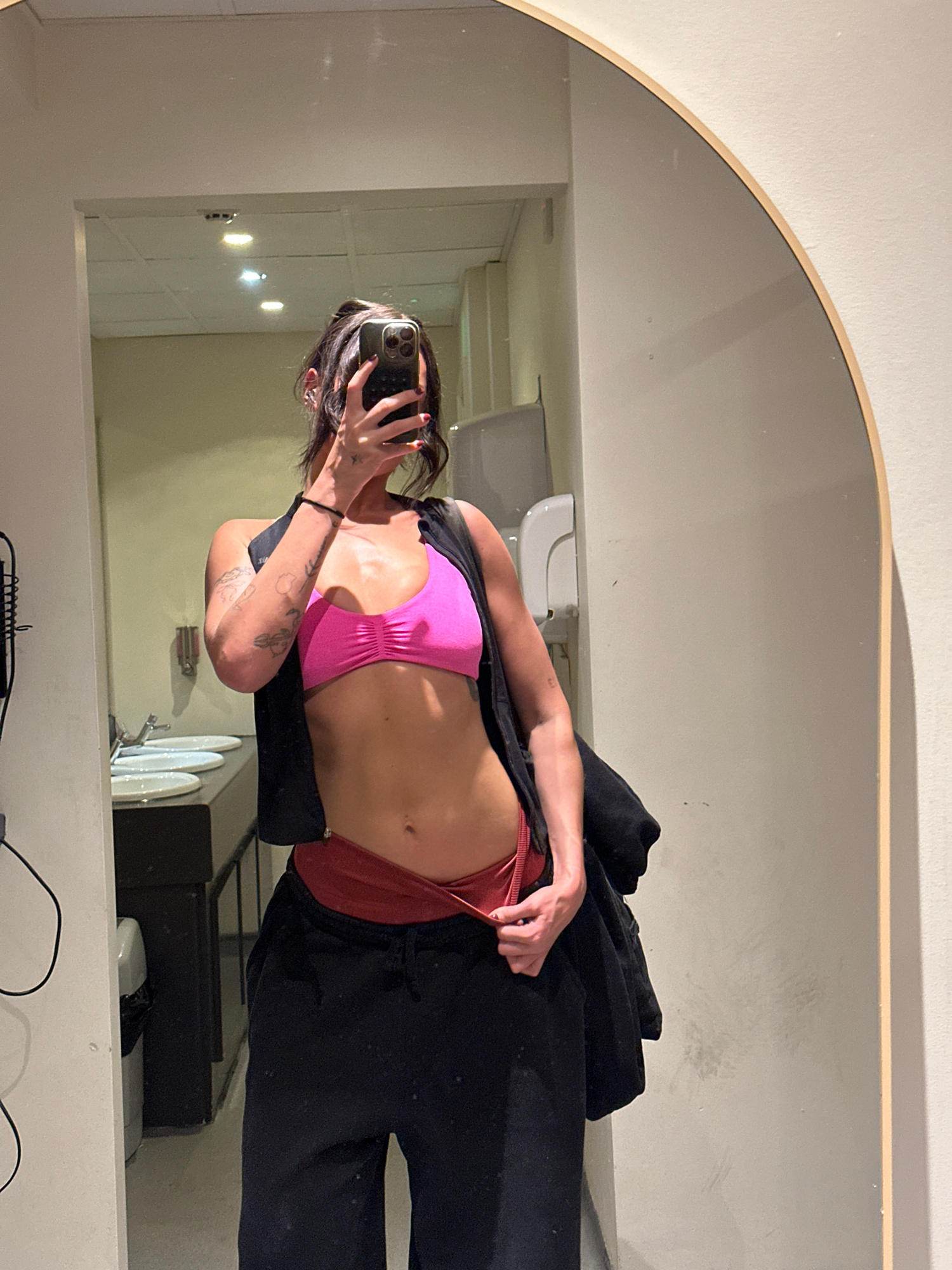 A woman is taking a selfie in a mirror, presumably in a bathroom. She is wearing a pink sports bra, red underwear, and black sweatpants with a black jacket draped over her shoulder. Her hair is dark w…read more