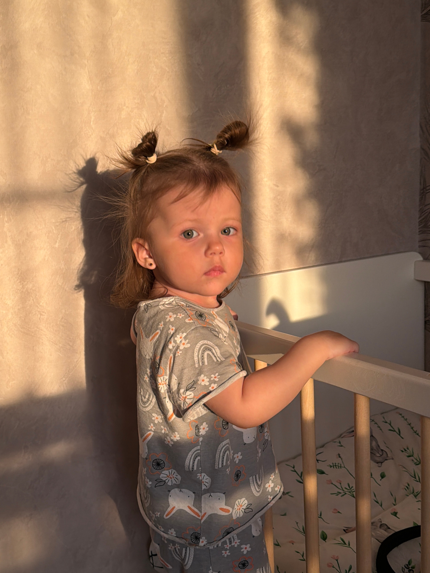 This image captures a young child lying on their back in an indoor setting, looking directly at the camera with a neutral, curious expression. The child has light brown hair styled in two small pigtai…read more