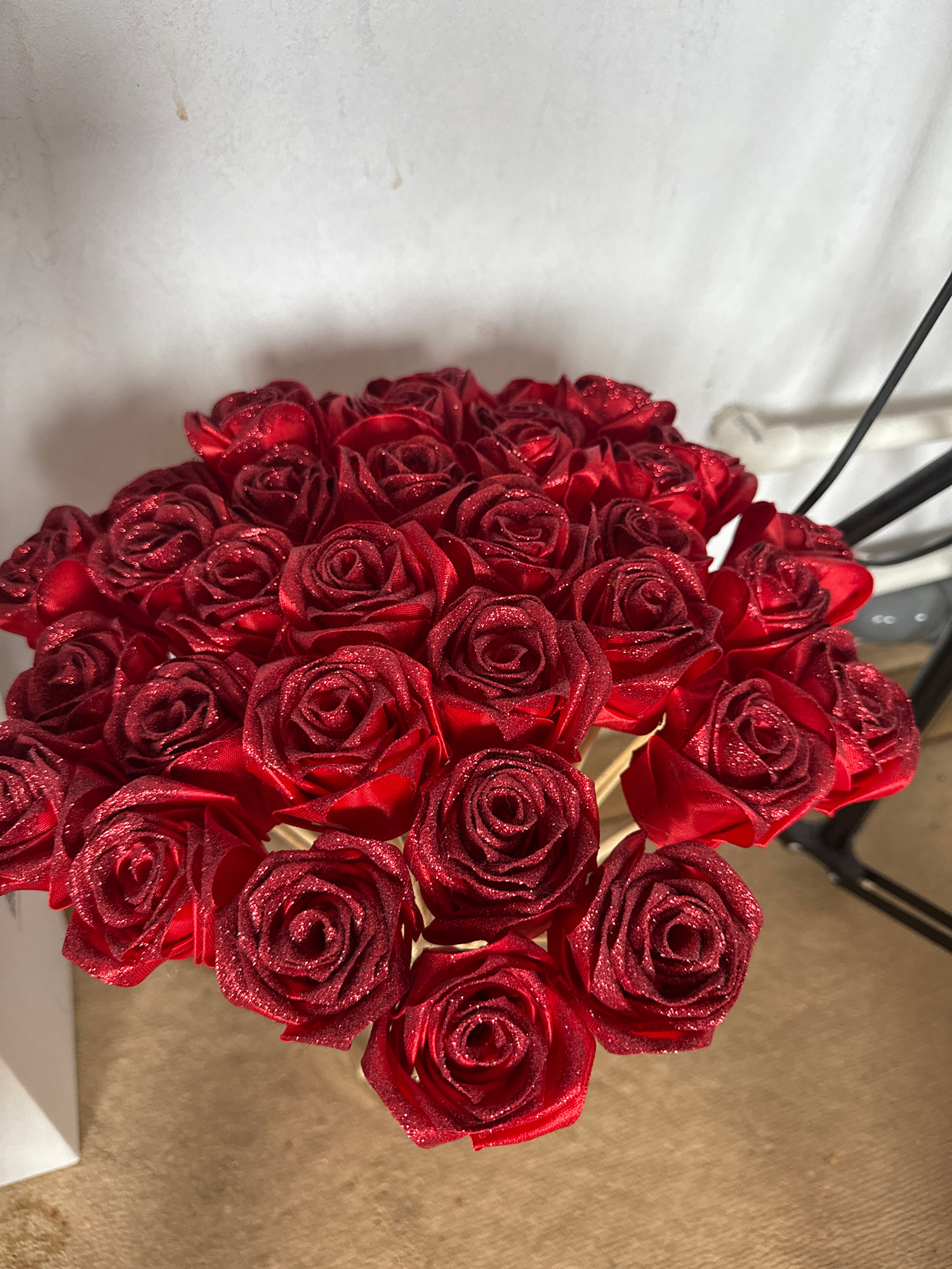 A close-up, high-angle shot reveals a bouquet of approximately 30 artificial red roses. The roses are uniformly red and appear to have a subtle glittery finish. The background is a mix of surfaces: a…read more