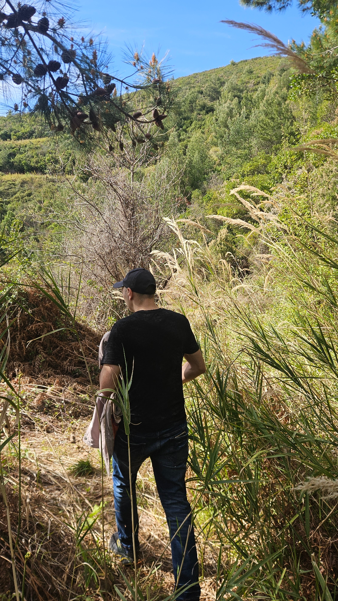 A man wearing a black T-shirt and blue jeans stands in an area with tall grass and vegetation in Budva, Montenegro. He is wearing a baseball cap and facing away from the camera towards a hillside cove…read more