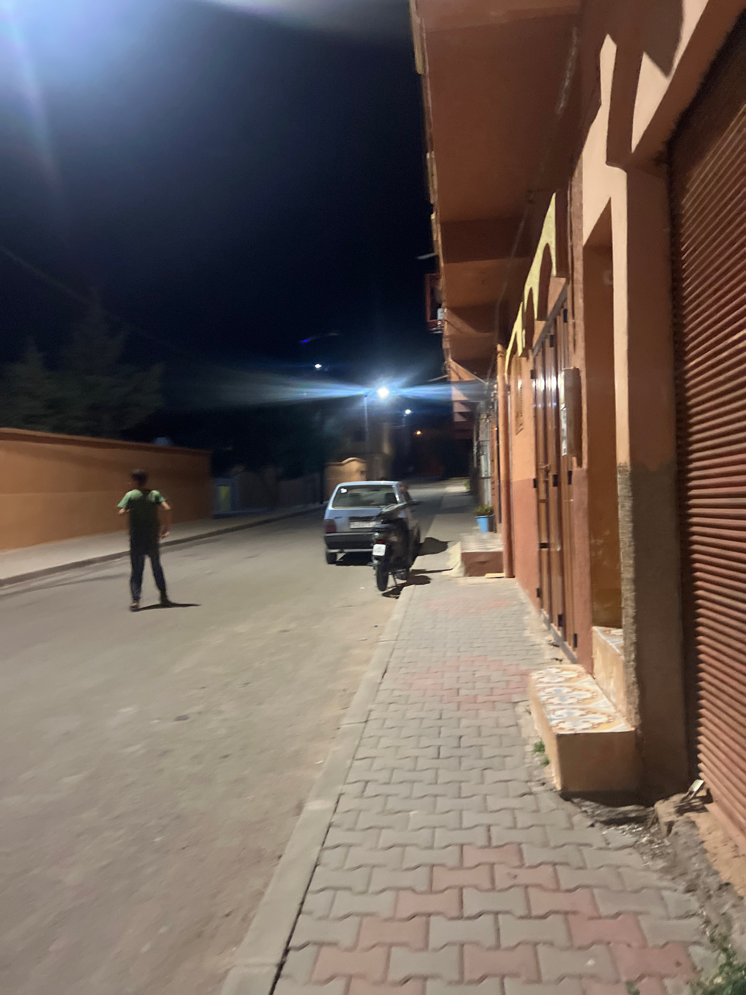 An eye-level outdoor shot in Ouaouizert, Morocco, depicts a street at night. A person in a green shirt and dark pants stands on the right side. Next to them, a motorcycle and white van are parked. The…read more