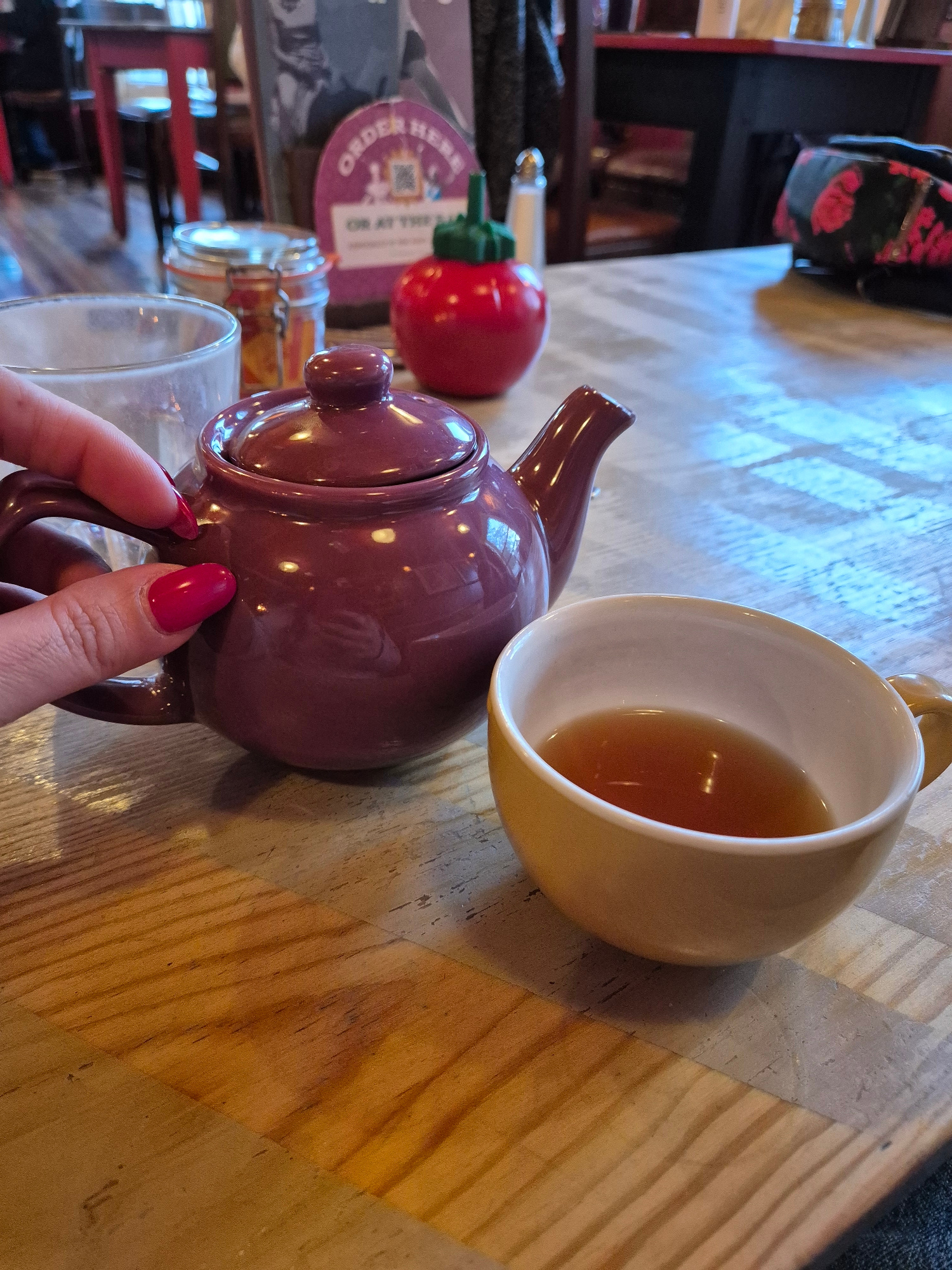 The image depicts a tea service on a wooden table. A partially filled yellow teacup rests on the table beside a dark purple teapot. A hand with red nail polish is holding the teapot's handle. Other ob…read more