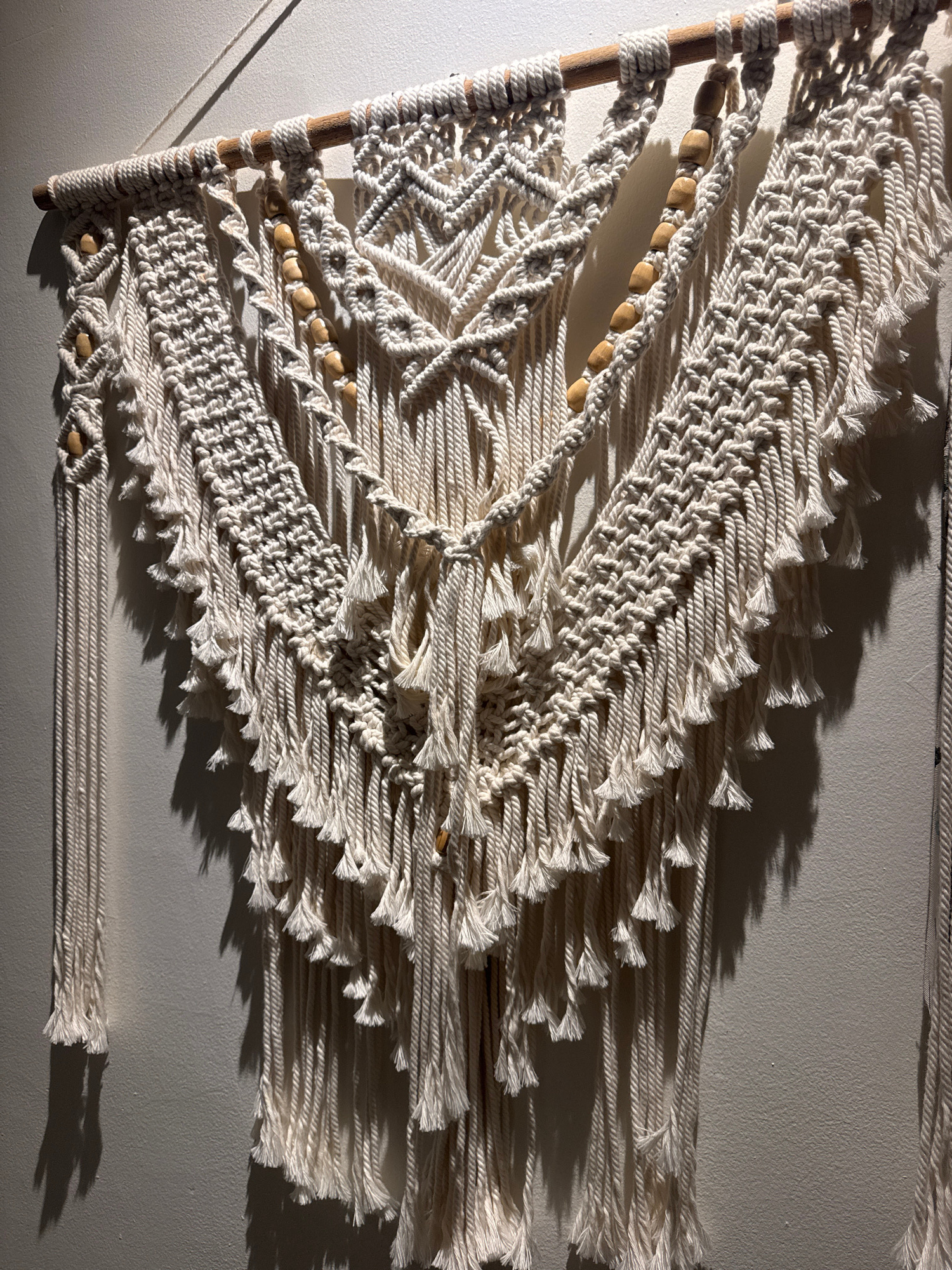 The image presents a close-up view of an intricate macrame wall hanging, handcrafted from thick, cream-colored cotton rope. The piece features a variety of knotting techniques, including dense square…read more