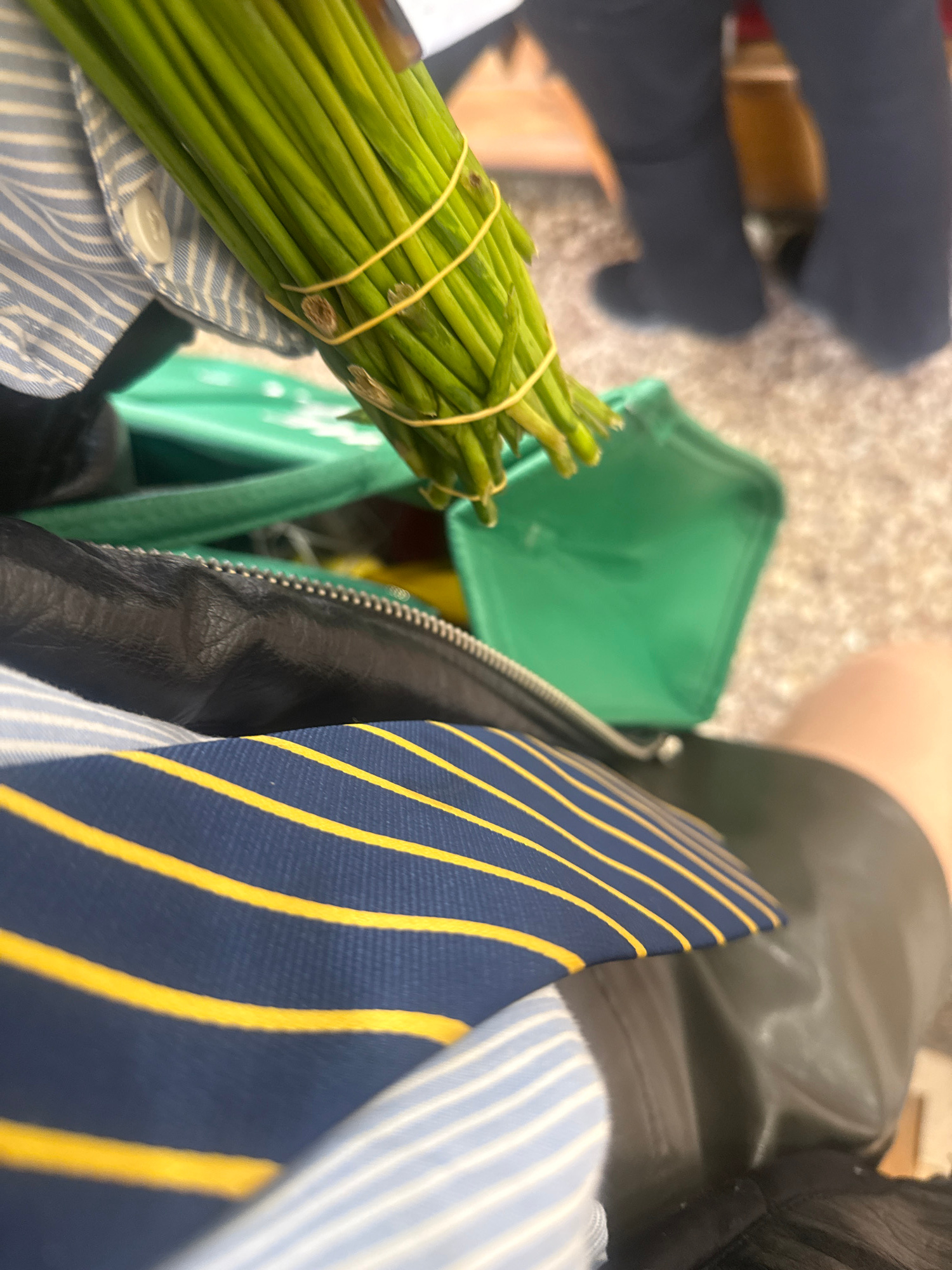 A close-up shot shows a bundle of green chives secured with two rubber bands, resting atop a light blue and white striped button-down shirt. Beside the chives, there's a green bag. Adjacent to the bag…read more