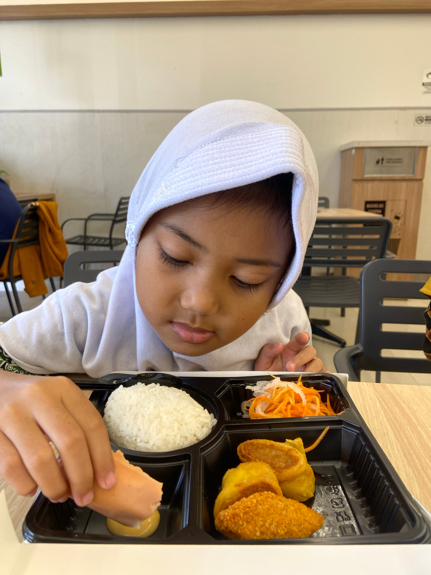A young person wearing a white head covering sits at a table in what appears to be a cafeteria or food court setting. The individual is holding a hotdog or sausage, seemingly about to eat it. Beside t…read more