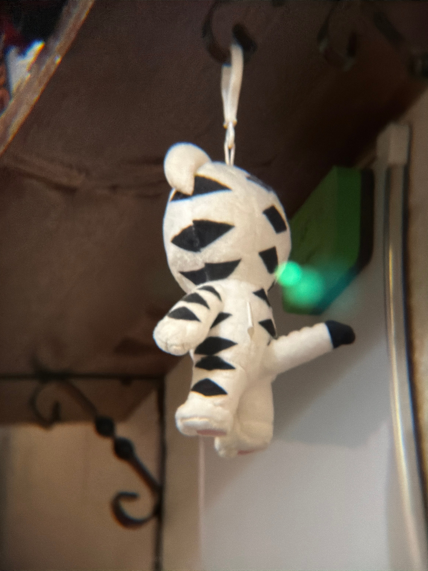 A white plush animal with black markings resembling a tiger is the central object, appearing to float mid-air within the scene. It has a long tail and a raised front leg, suggestive of a walking pose.…read more