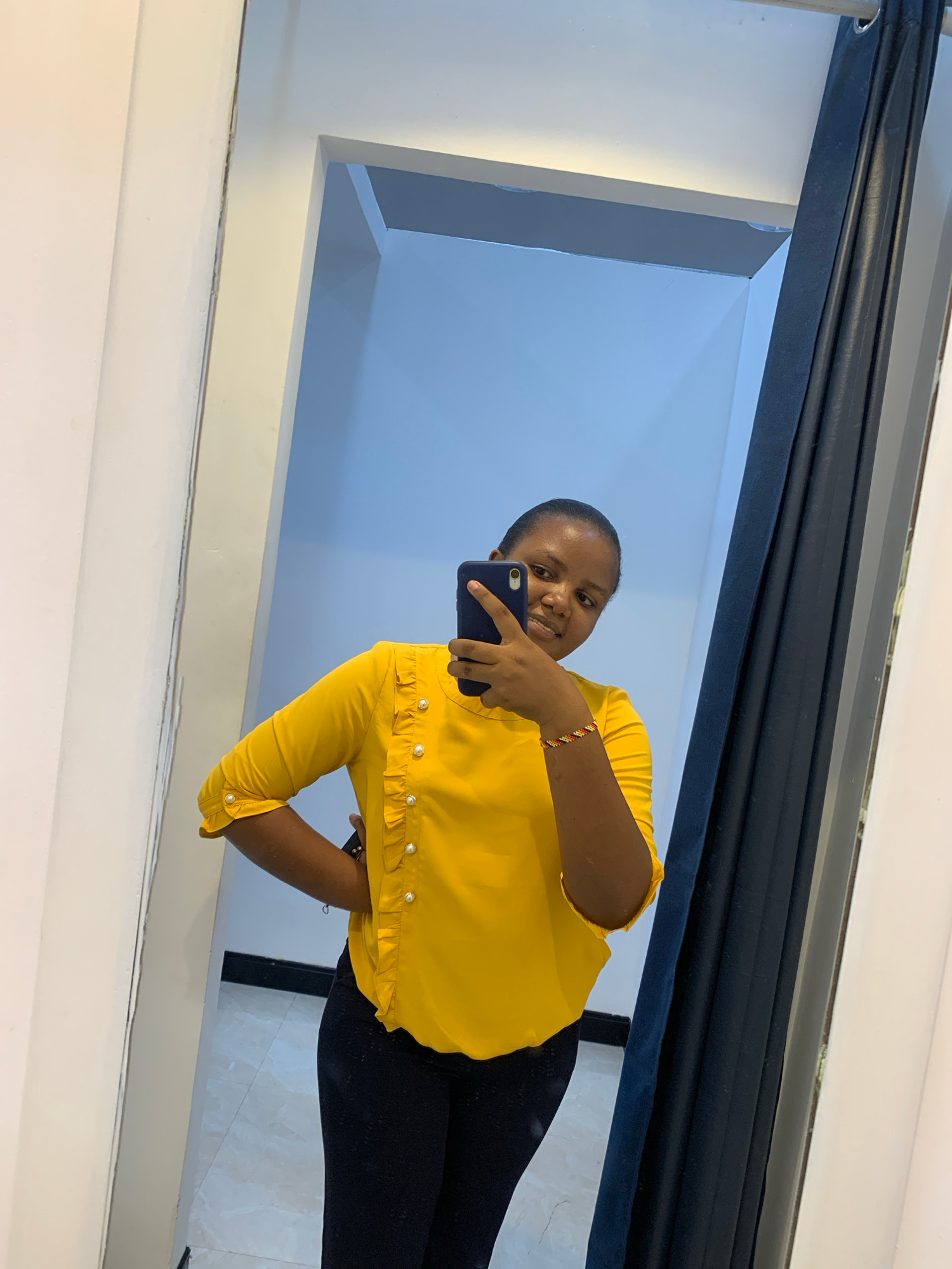 A woman is reflected in a mirror, holding a smartphone and taking a selfie. She is wearing a yellow blouse with ruffles and pearl-like buttons, and black leggings. The background suggests an indoor sp…read more