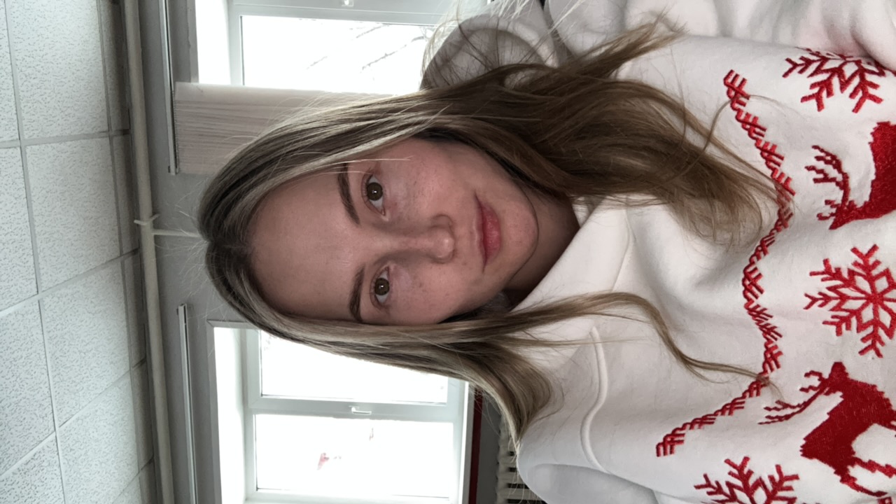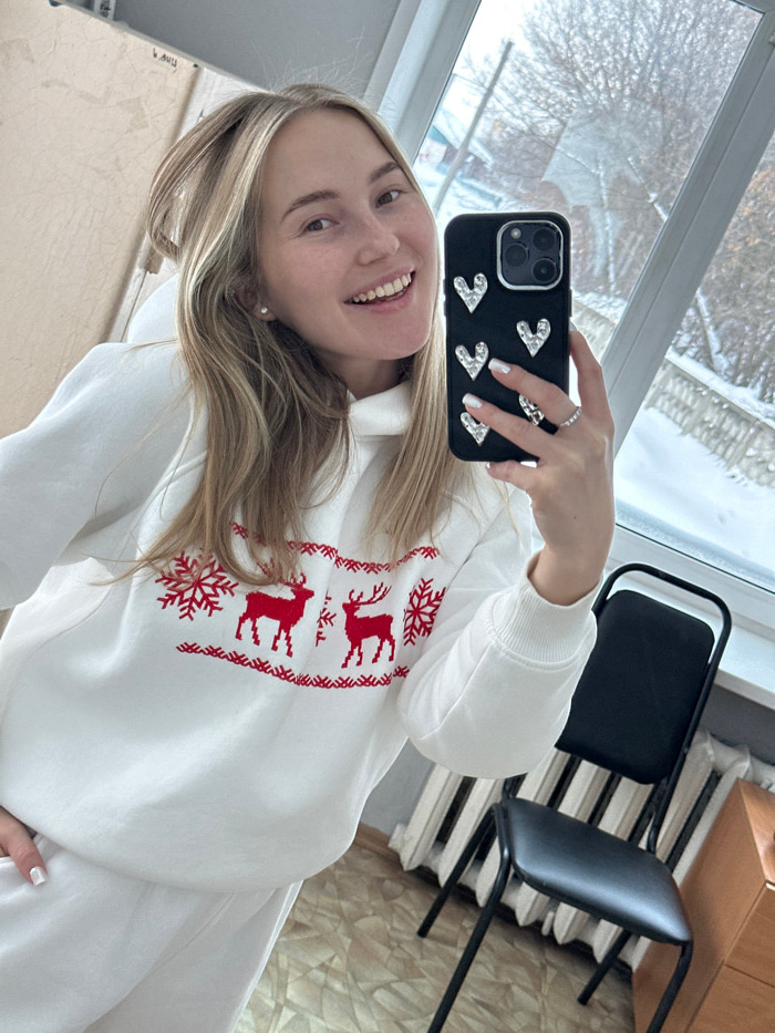 A female subject is captured in a selfie taken indoors, appearing to be reflected in a mirror or glass surface. She has long, blonde hair and is smiling broadly, revealing her teeth. She wears a white…read more
