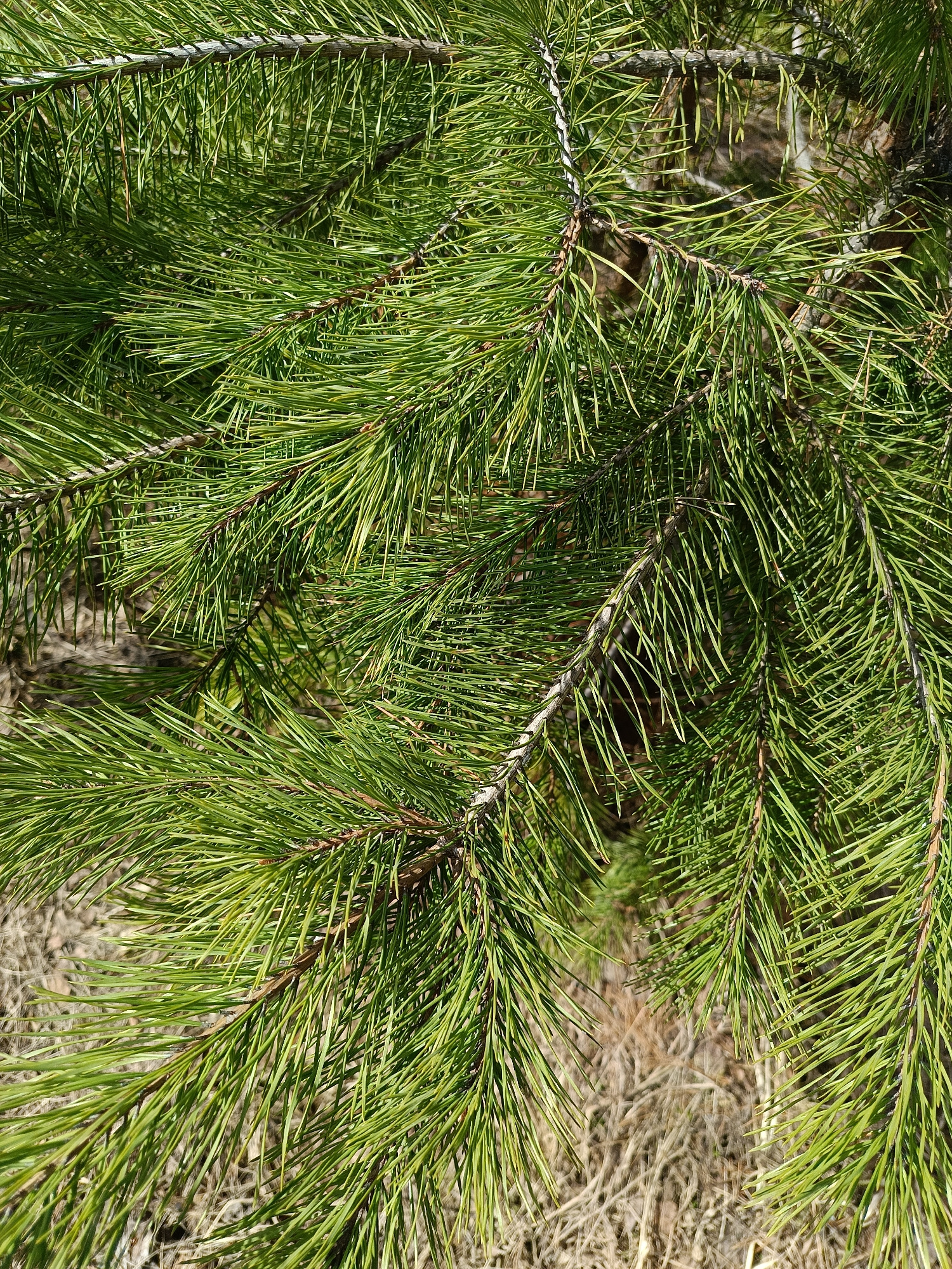 The image shows a close-up view of a pine tree branch. The needles are green and clustered tightly together. The branch is brown and textured. In the background, there is a patch of dry grass. The loc…read more