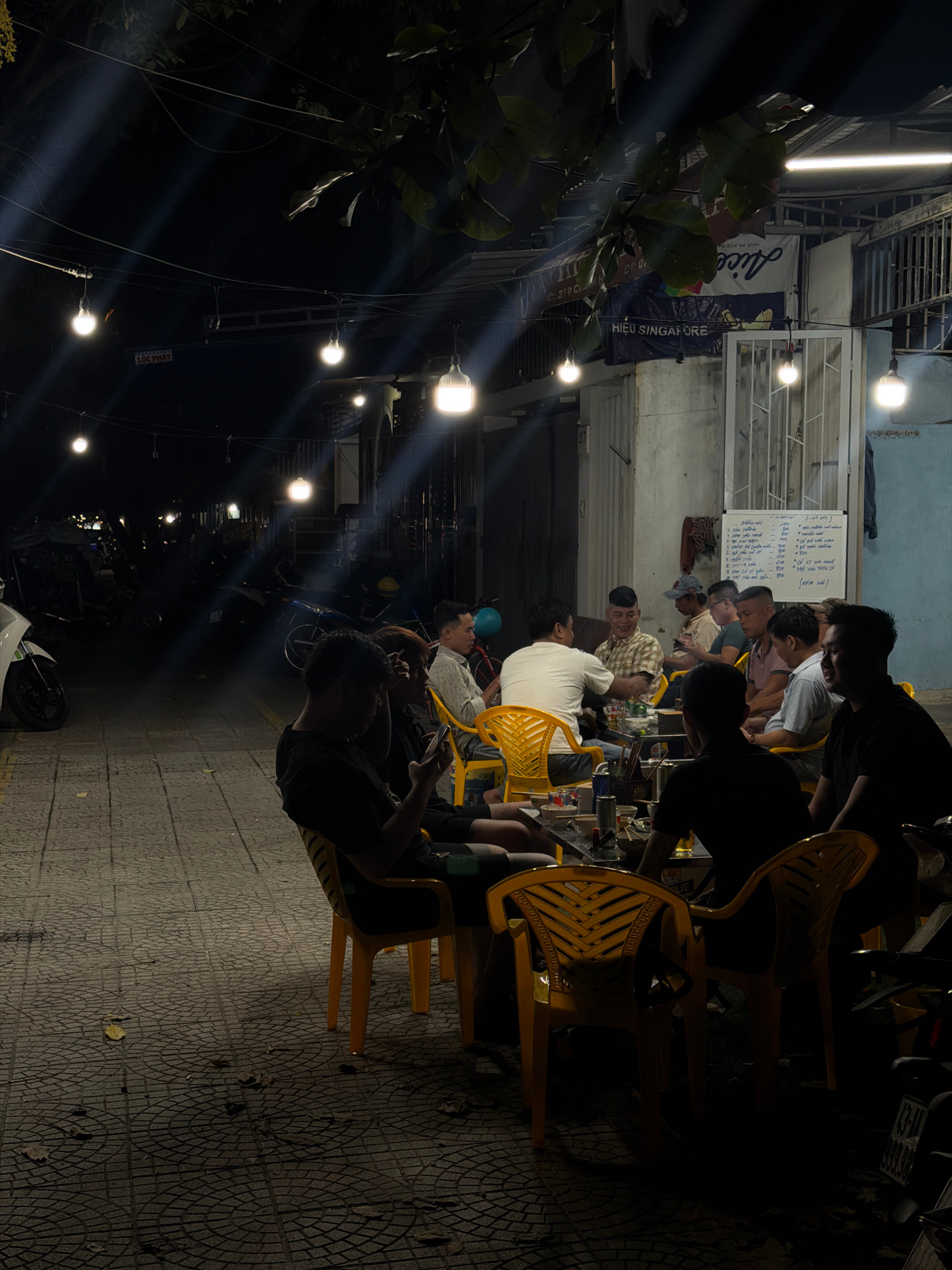 At night in Đà Nẵng, Vietnam, people sit at plastic tables and chairs alongside a street lit by overhead lights. The street is paved with interlocking circular patterned tiles. There are parked scoote…read more