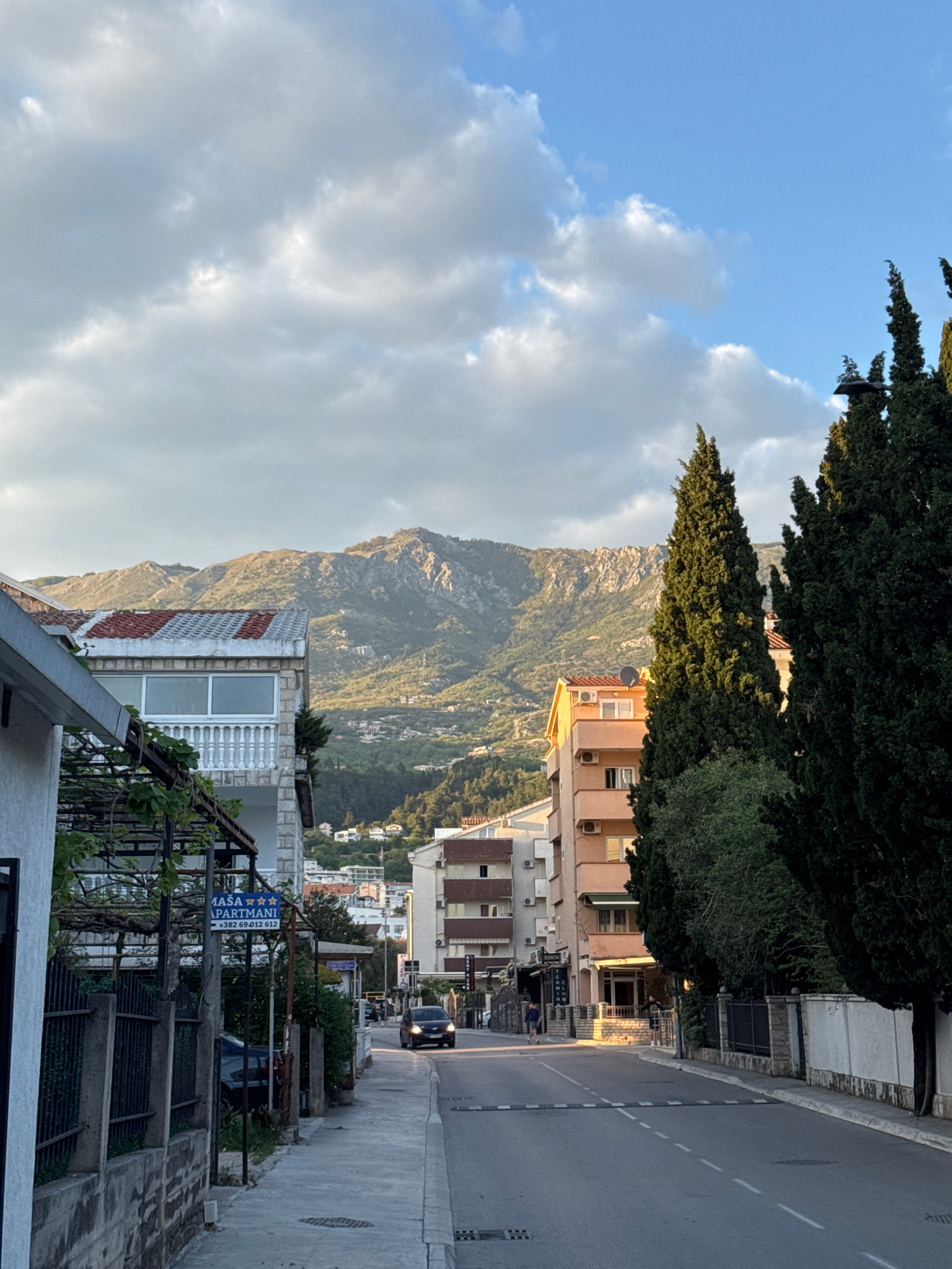 The image depicts a street scene in Budva, Montenegro. In the foreground, there is a sidewalk on the left side and a road on the right. Buildings line the street, including apartments and a business w…read more