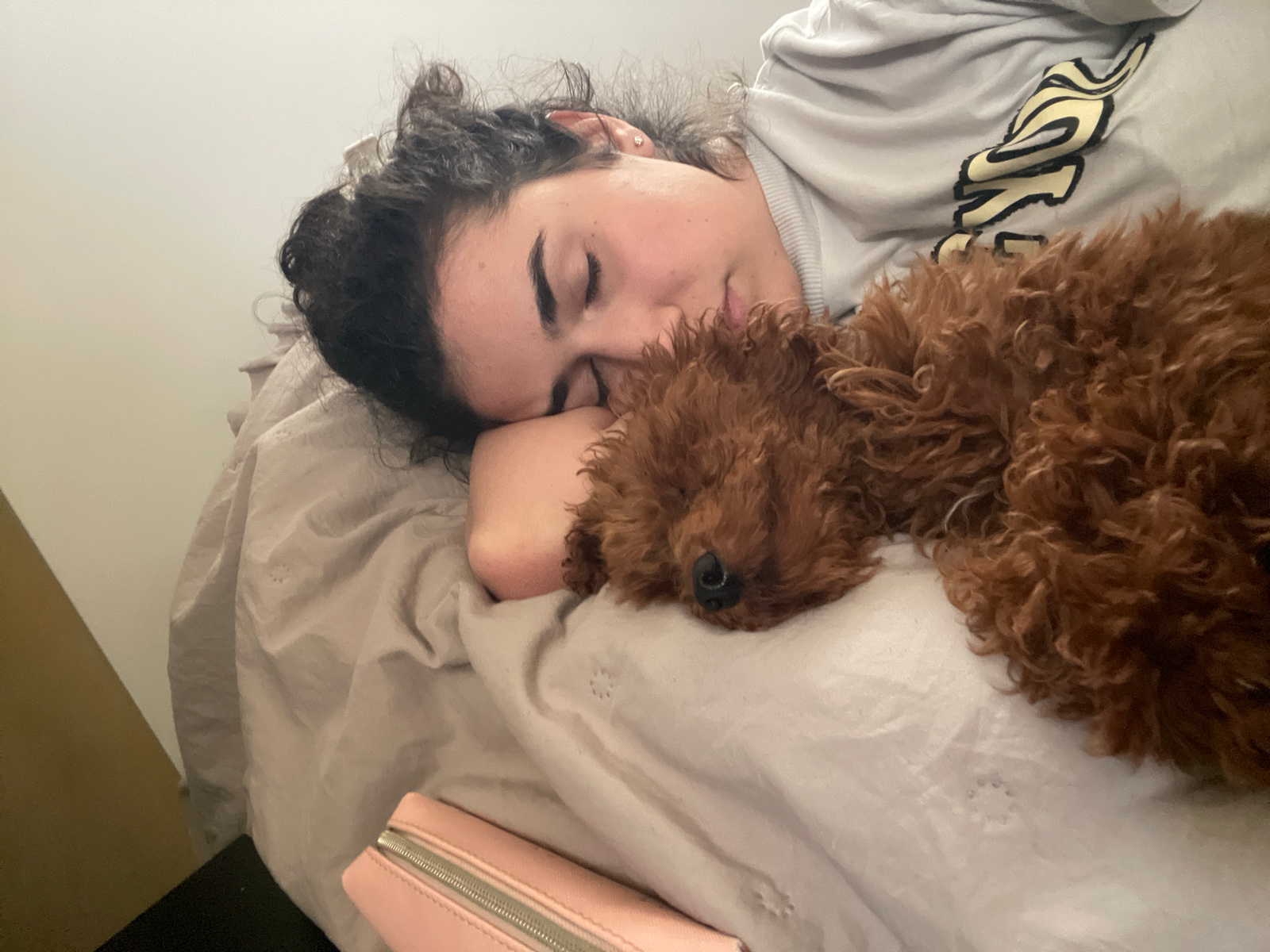 A woman and a brown poodle are lying in bed. The woman is on her side, with her eyes closed and her head resting on her arm. She has dark hair and is wearing a light gray shirt with a graphic design o…read more