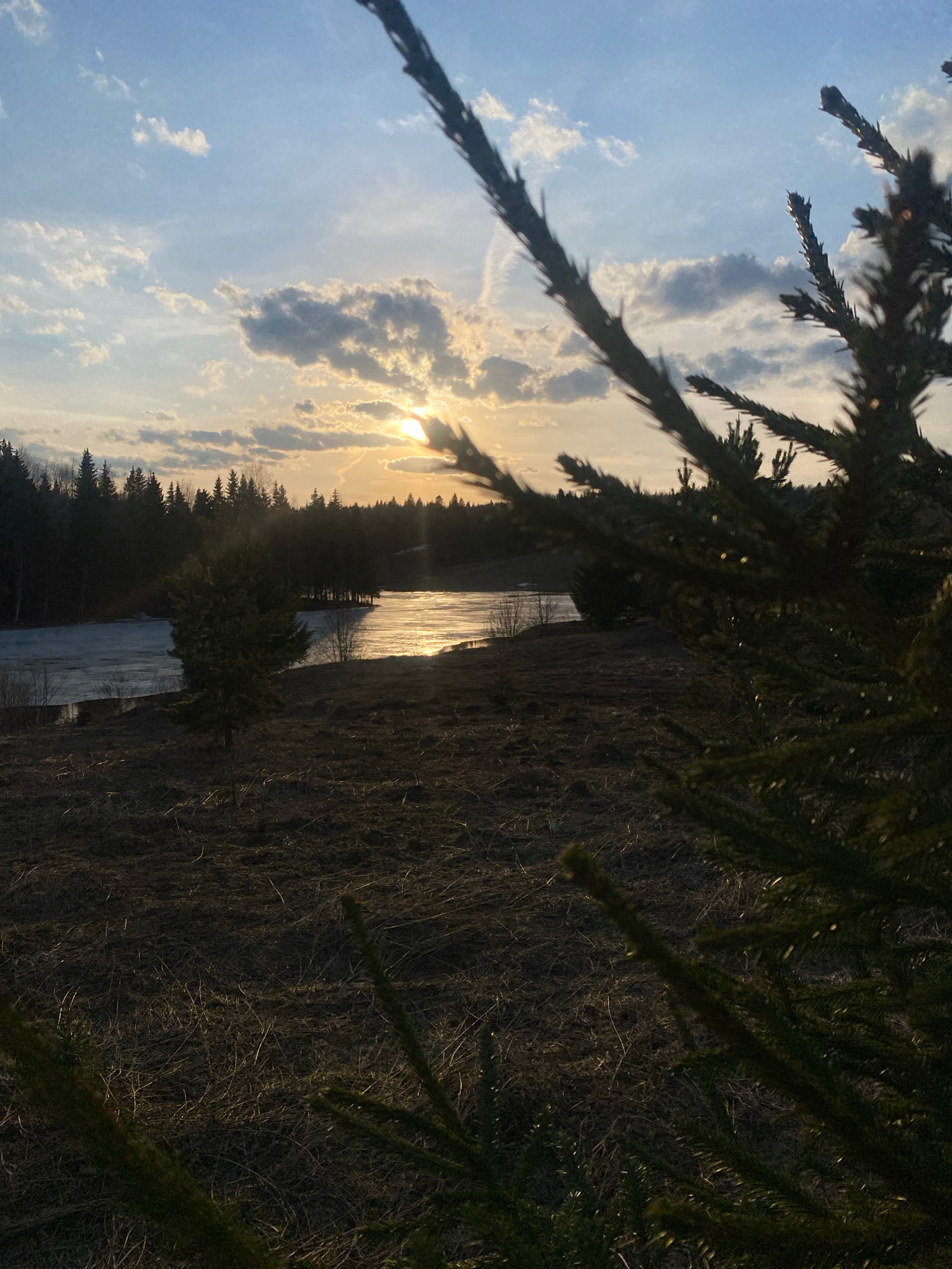 This image depicts a serene natural landscape, captured at what appears to be either sunrise or sunset, with the sun low in the sky. Dark, silhouetted branches of a coniferous tree, likely a spruce or…read more