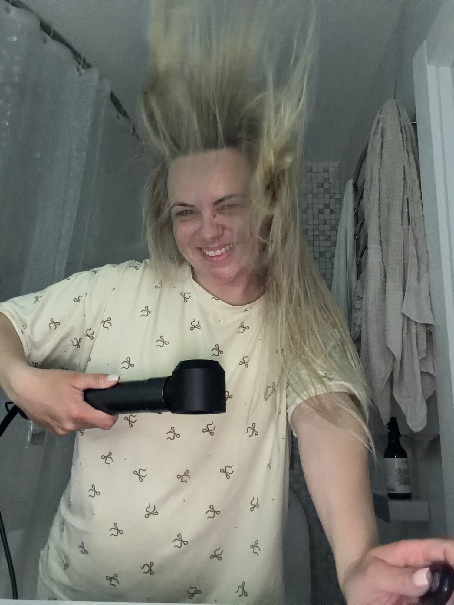 The image displays a blonde woman actively drying her hair in what appears to be a bathroom. Her hair is dynamically fanned out and flying upwards, indicating the force of the black, modern hair dryer…read more
