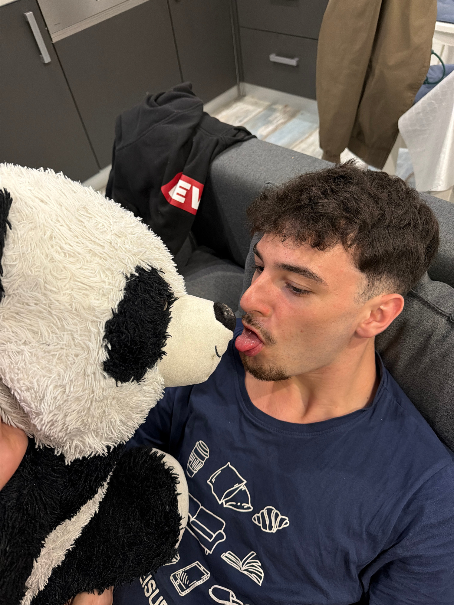 A man with curly dark hair and stubble lies on a gray sofa, wearing a dark blue t-shirt with white drawings of food items and a mobile phone. He is sticking his tongue out towards a stuffed skunk toy…read more