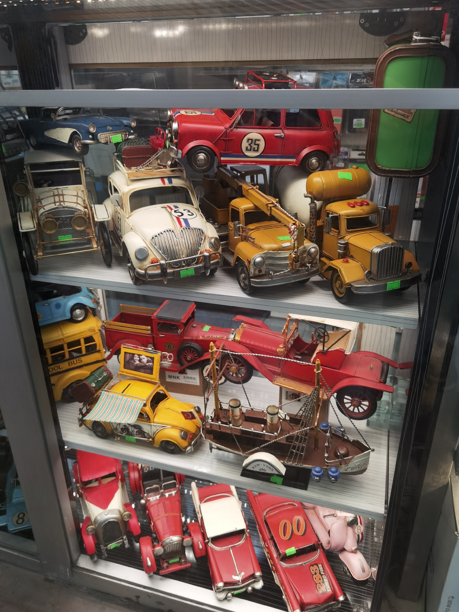 The media file captures a detailed display cabinet filled with numerous vintage-style miniature vehicle models, likely made of painted metal, in what appears to be a shop or exhibit in Beyoğlu, Turkey…read more