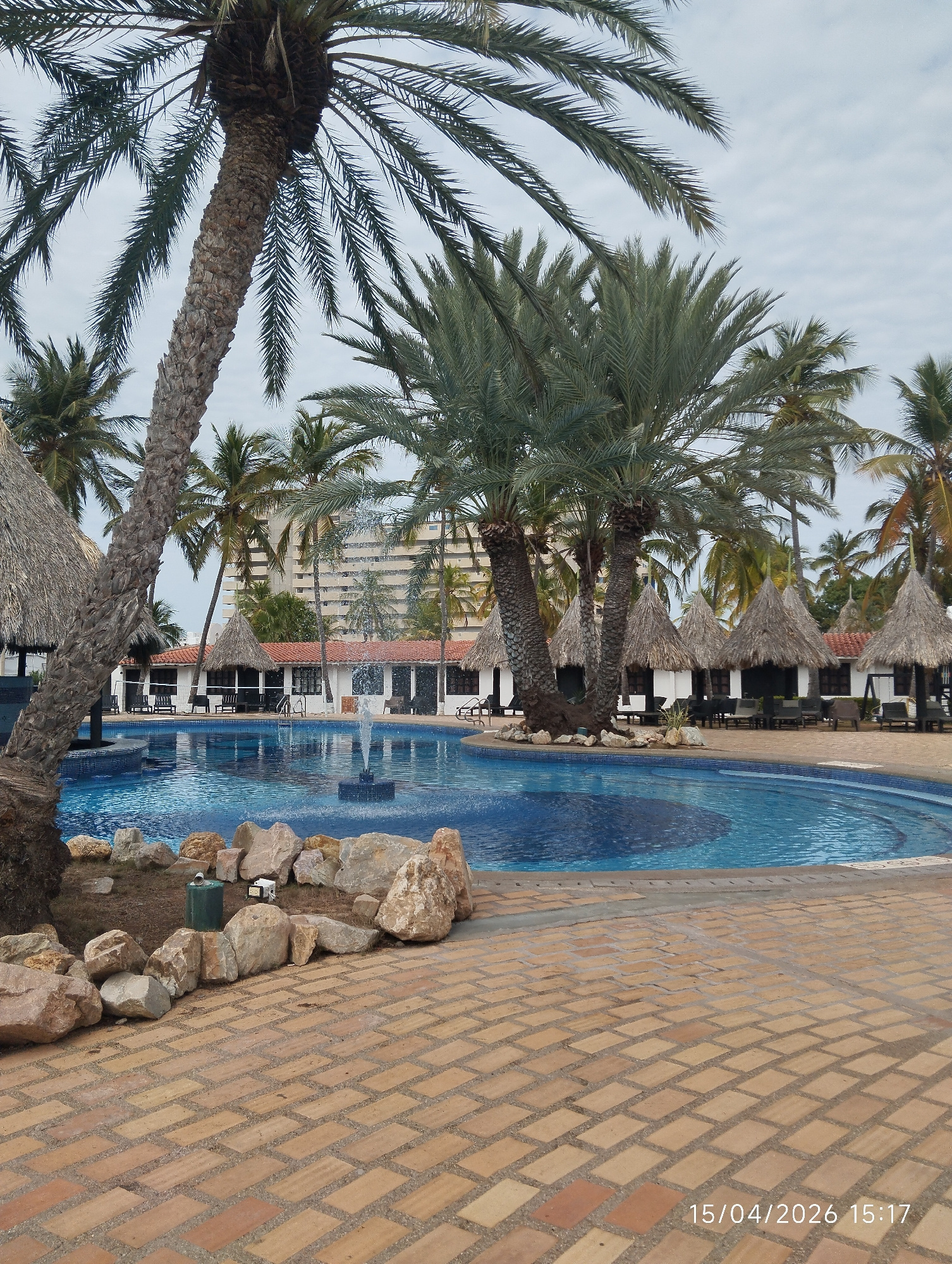 This image depicts a resort swimming pool area located in Porlamar, Venezuela. The foreground consists of a brick-paved patio that surrounds the pool. A landscaped area with rocks, grass, and utilityโฆread more