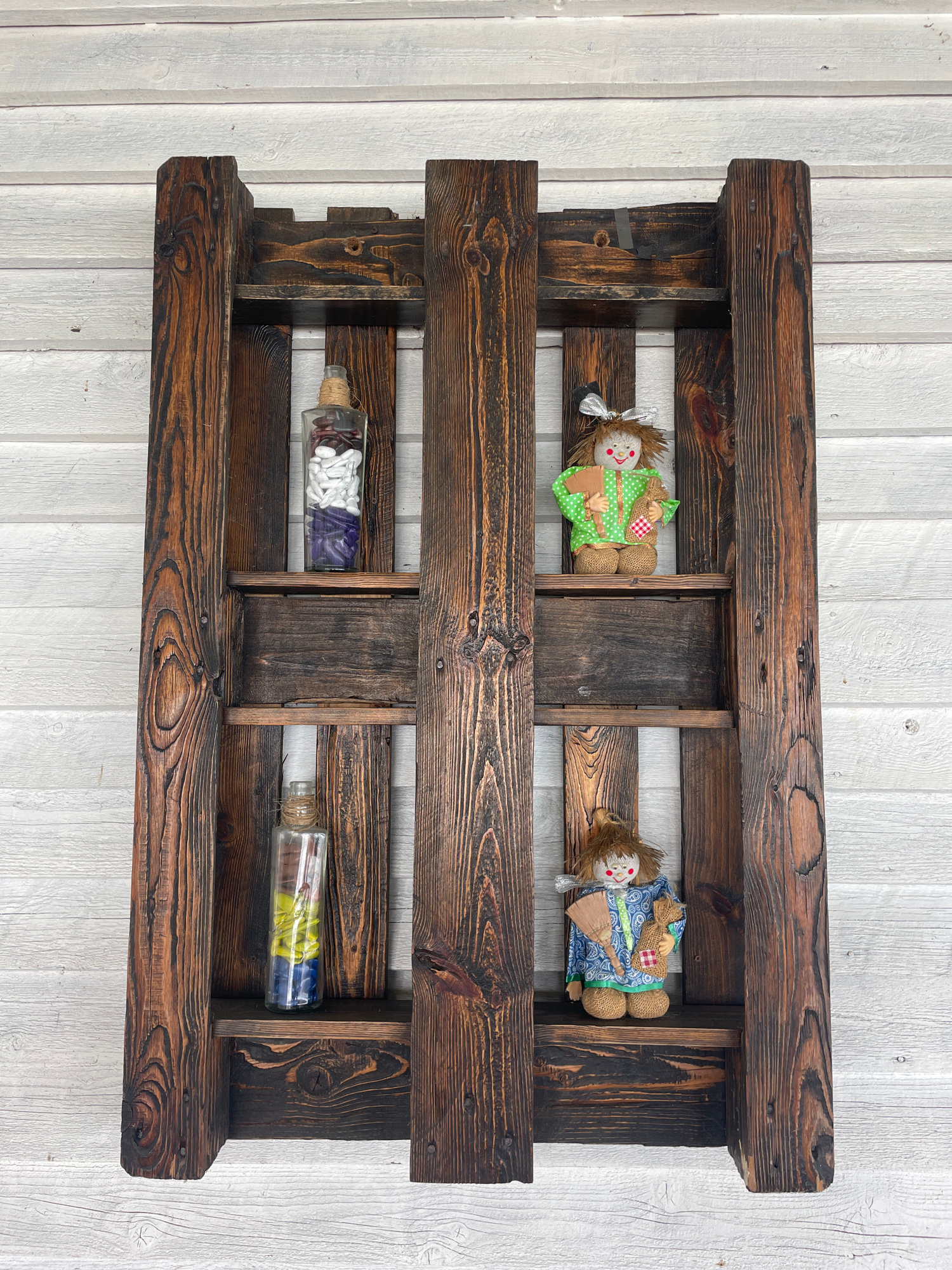 The image shows a handcrafted wooden pallet shelf mounted on a white, vertically-oriented wood plank wall. The shelf, made of dark-stained wood, has four sections or shelves created by horizontal and…read more