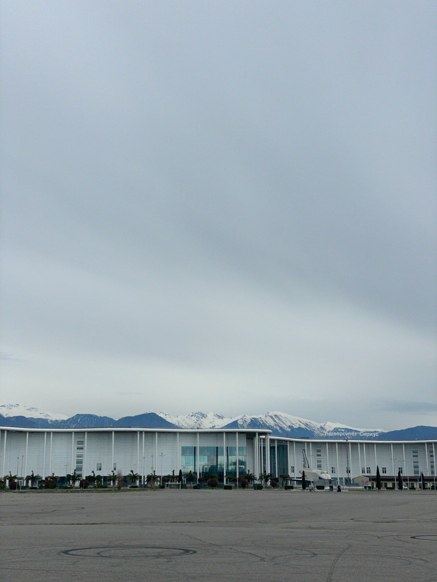 A view of the Sirius University building in the city of Sirius, Russia. The large, modern building has a white facade with repetitive windows and vertical columns. Behind the building, there are snow-…read more